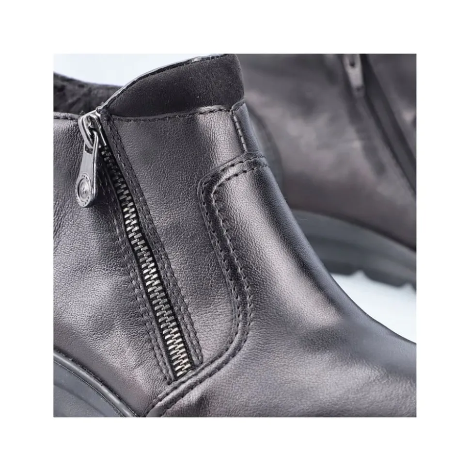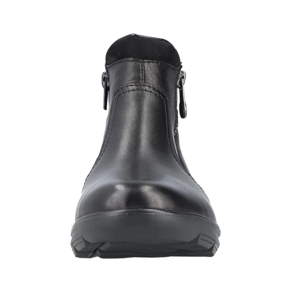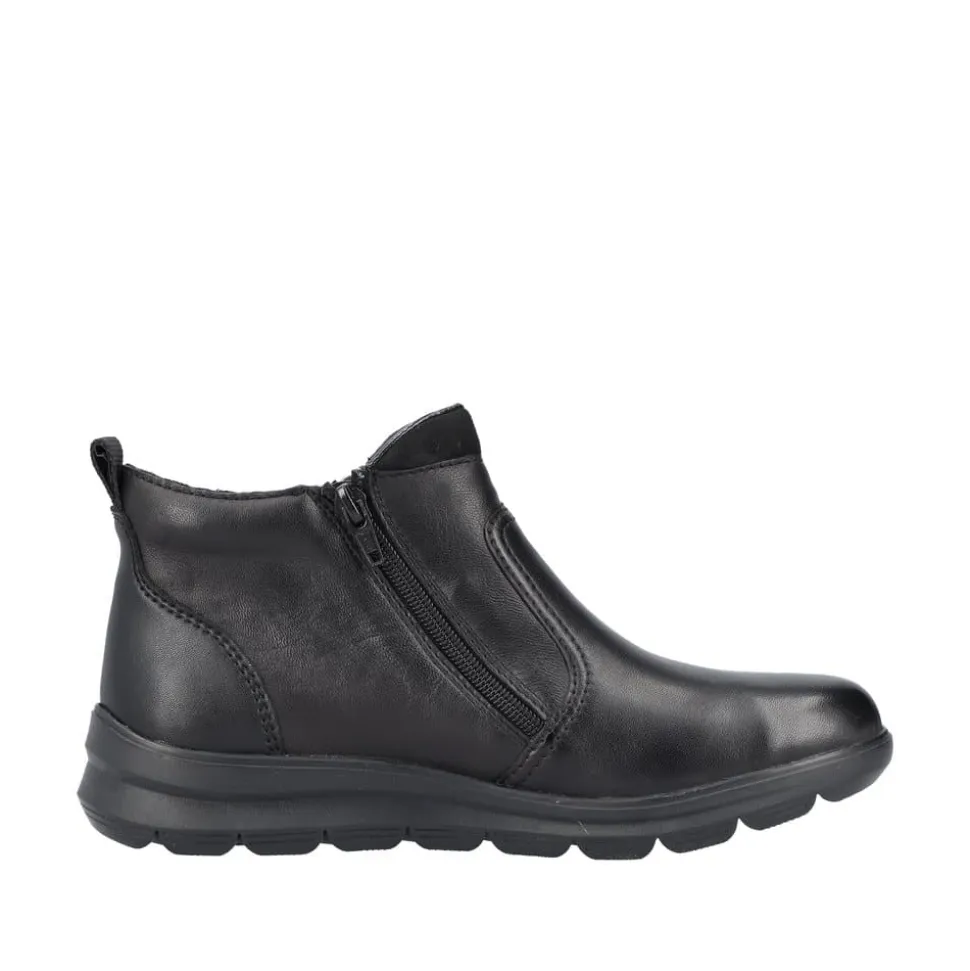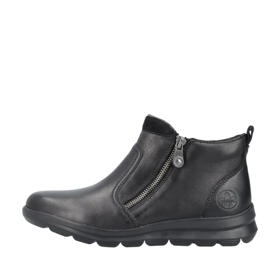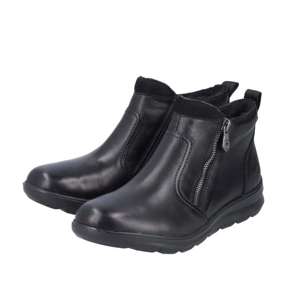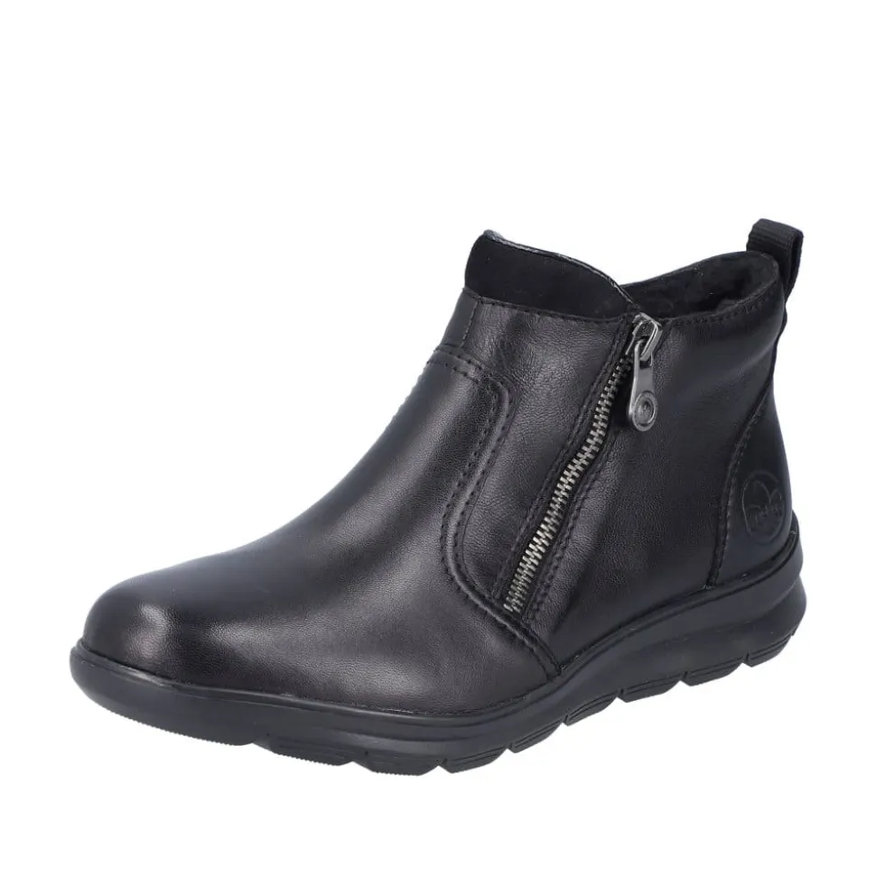 Rieker støvle til dame i sort. Moderne støvle i sort med en overdel i skind og et klassisk design, der giver et stilfuldt udtryk. Støvlen har to funktionelle lynlåse, som gør den nem at tage af og på. Indvendigt finder du en blød og udtagelig indersål, mens den varme foring sørger for, at dine fødder holdes lune. Den stødabsorberende ydersål med et godt mønster giver øget støtte og skridsikkerhed.