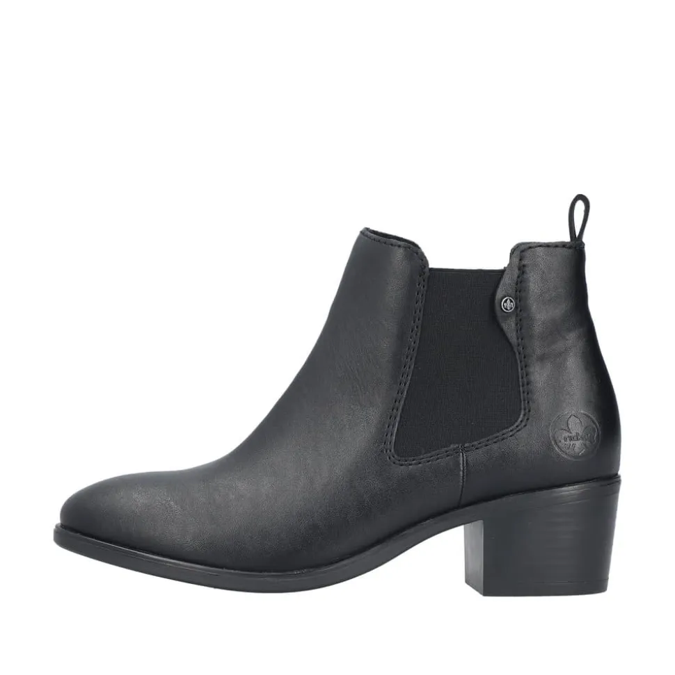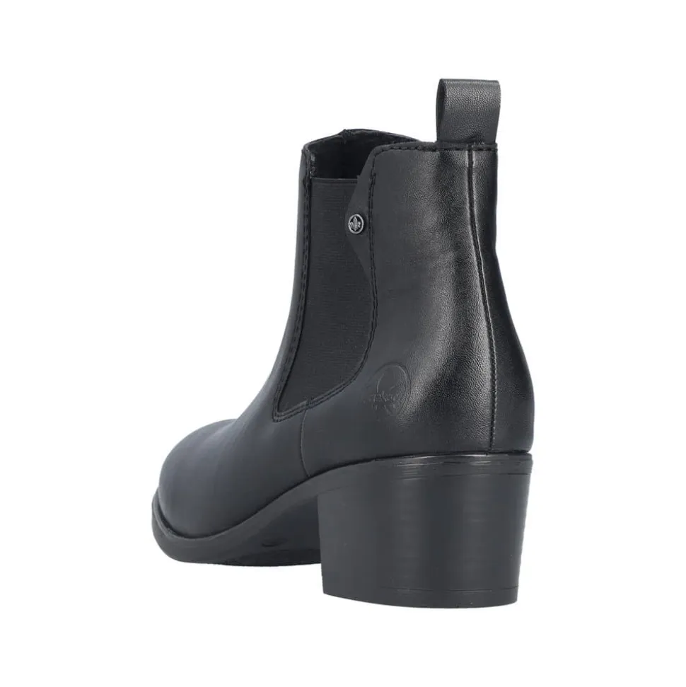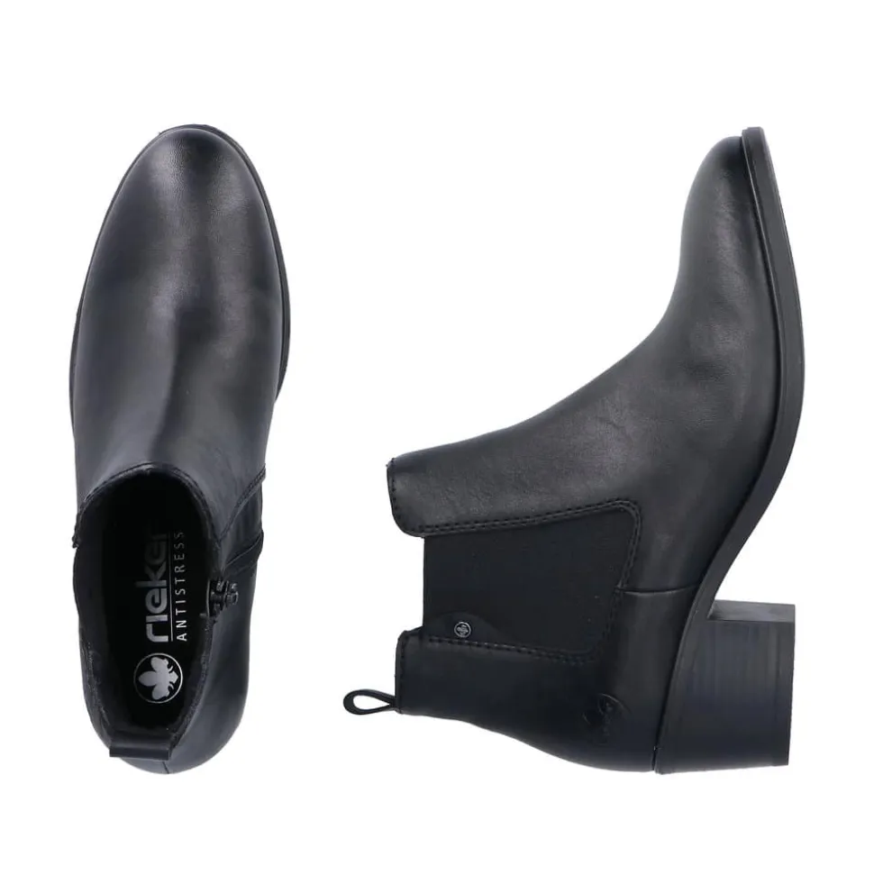 Rieker støvle til dame i sort. Flot klassisk støvle, der er perfekt til finere brug. Modellen har en funktionel lynlås på indersiden og en elastik på ydersiden, som gør den let at tage af og på. Indvendigt sørger en blød sål og en let foring for behagelig komfort hele dagen. Støvlen er designet med en blokhæl på 5 cm, der giver et elegant løft uden at gå på kompromis med komforten. Den mønstrede ydersål giver både øget stødabsorbering og skridsikkerhed.