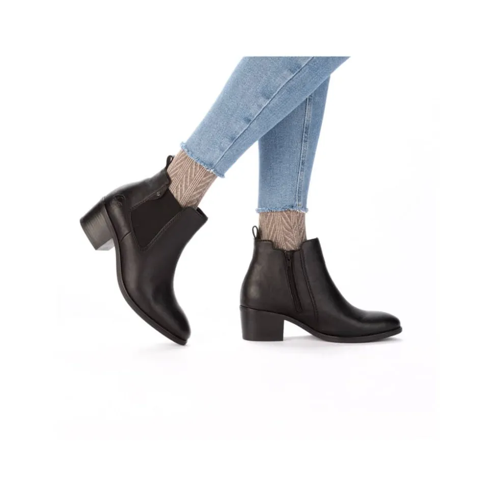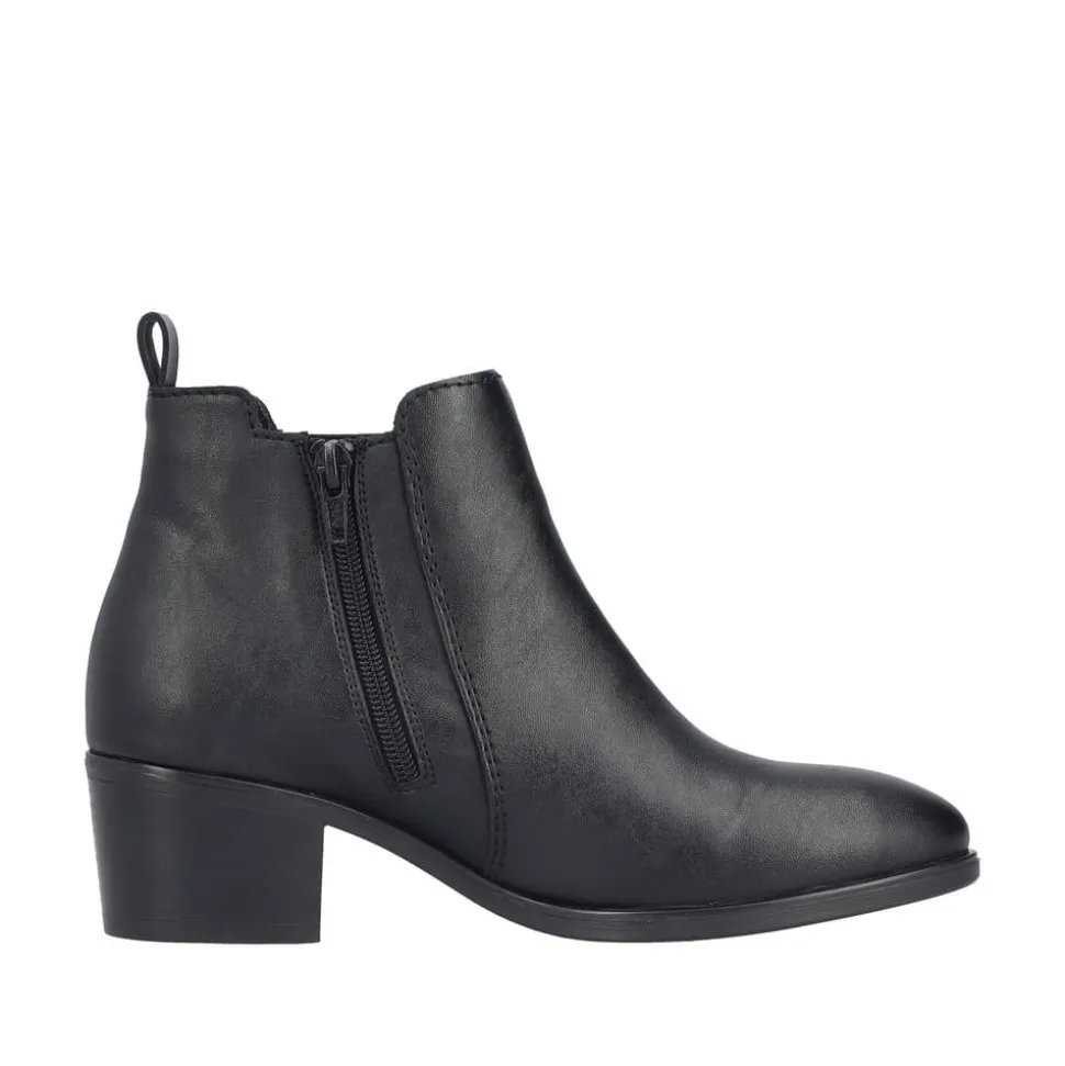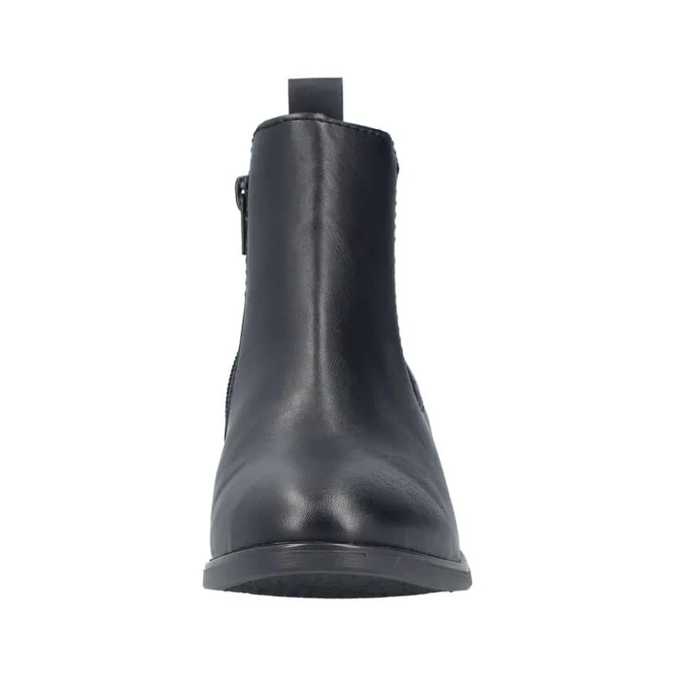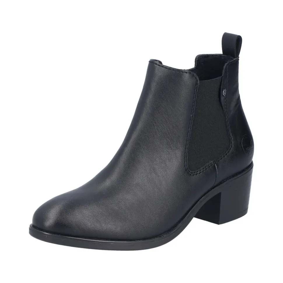 Rieker støvle til dame i sort. Flot klassisk støvle, der er perfekt til finere brug. Modellen har en funktionel lynlås på indersiden og en elastik på ydersiden, som gør den let at tage af og på. Indvendigt sørger en blød sål og en let foring for behagelig komfort hele dagen. Støvlen er designet med en blokhæl på 5 cm, der giver et elegant løft uden at gå på kompromis med komforten. Den mønstrede ydersål giver både øget stødabsorbering og skridsikkerhed.