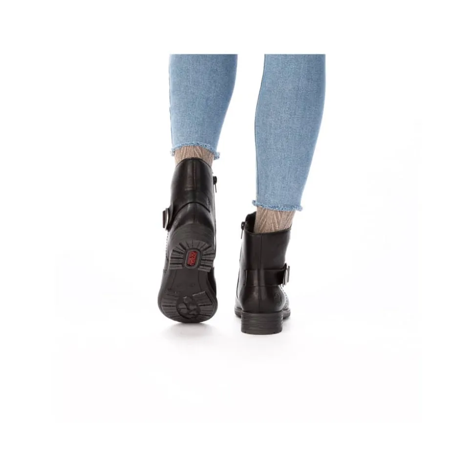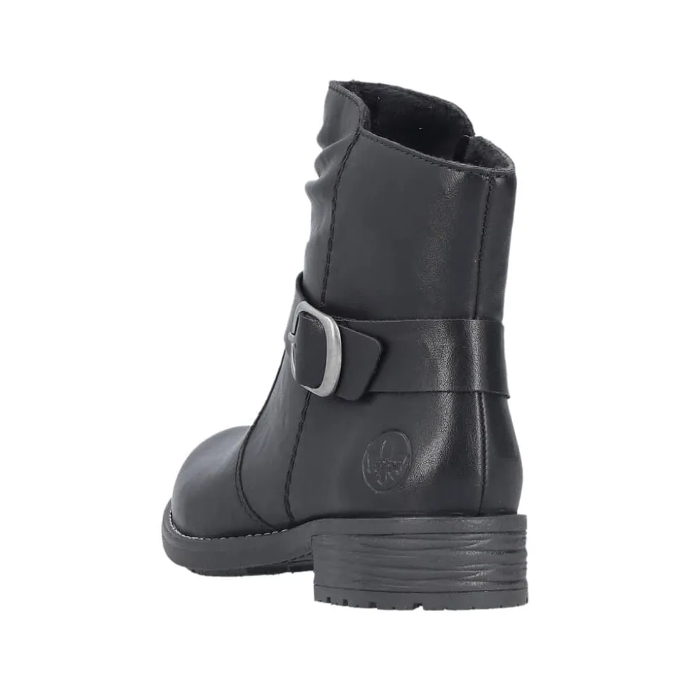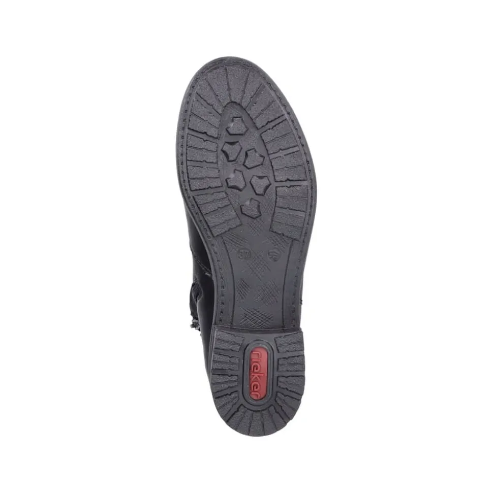 Rieker støvle til dame i sort. Denne sorte støvle kombinerer et klassisk design med moderne detaljer. Den smukke spænde på siden giver et stilfuldt udtryk, og lynlåsen på indersiden gør det enkelt at tage støvlen af og på. Indvendigt er den udstyret med en let foring og en blød, udtagelig indersål, som sikrer behagelig komfort dagen igennem. Med en blokhæl på ca. 3,5 cm får du et flot løft, mens ydersålen med stødabsorbering og mønster giver stabilitet og øget skridsikkerhed.
