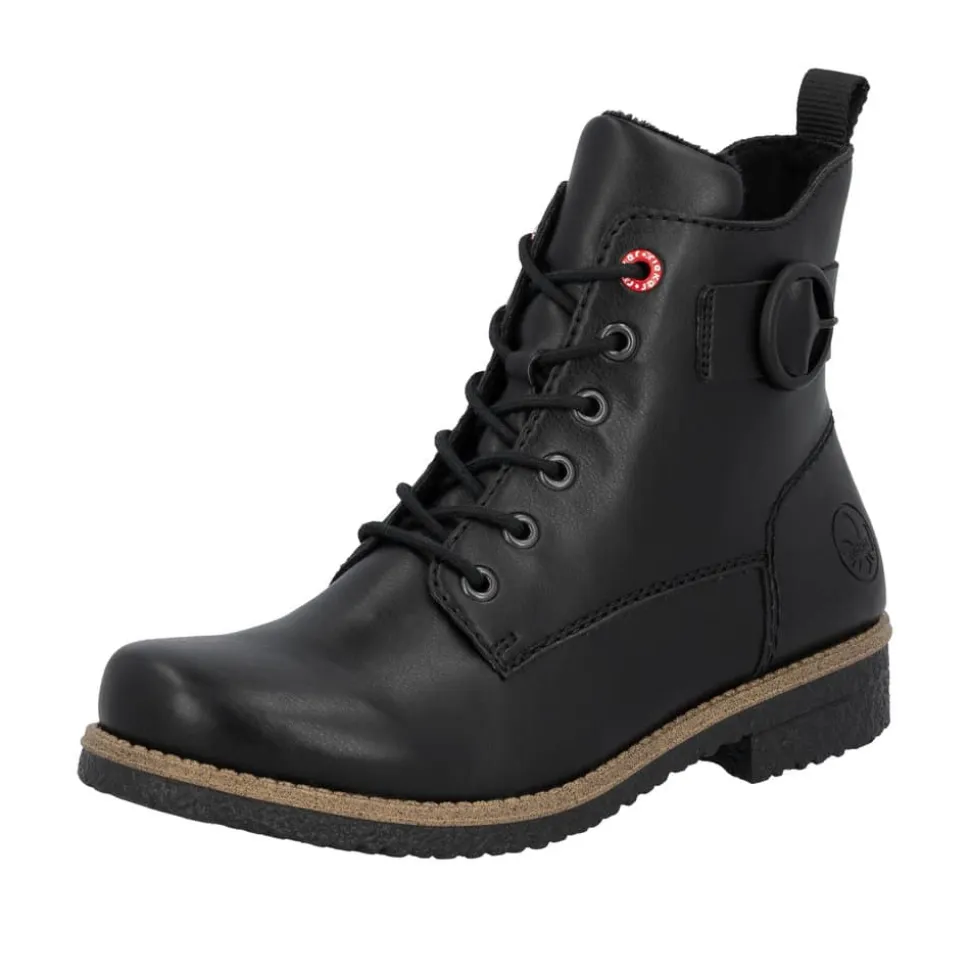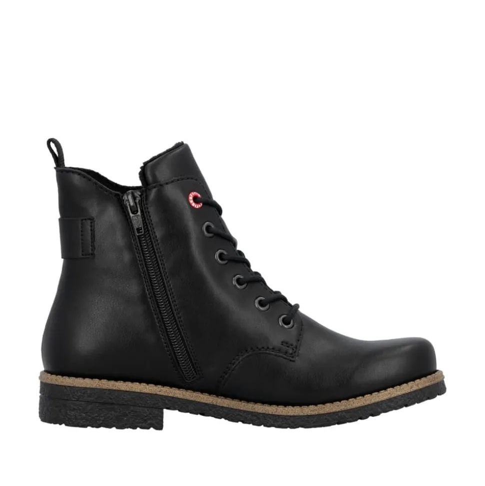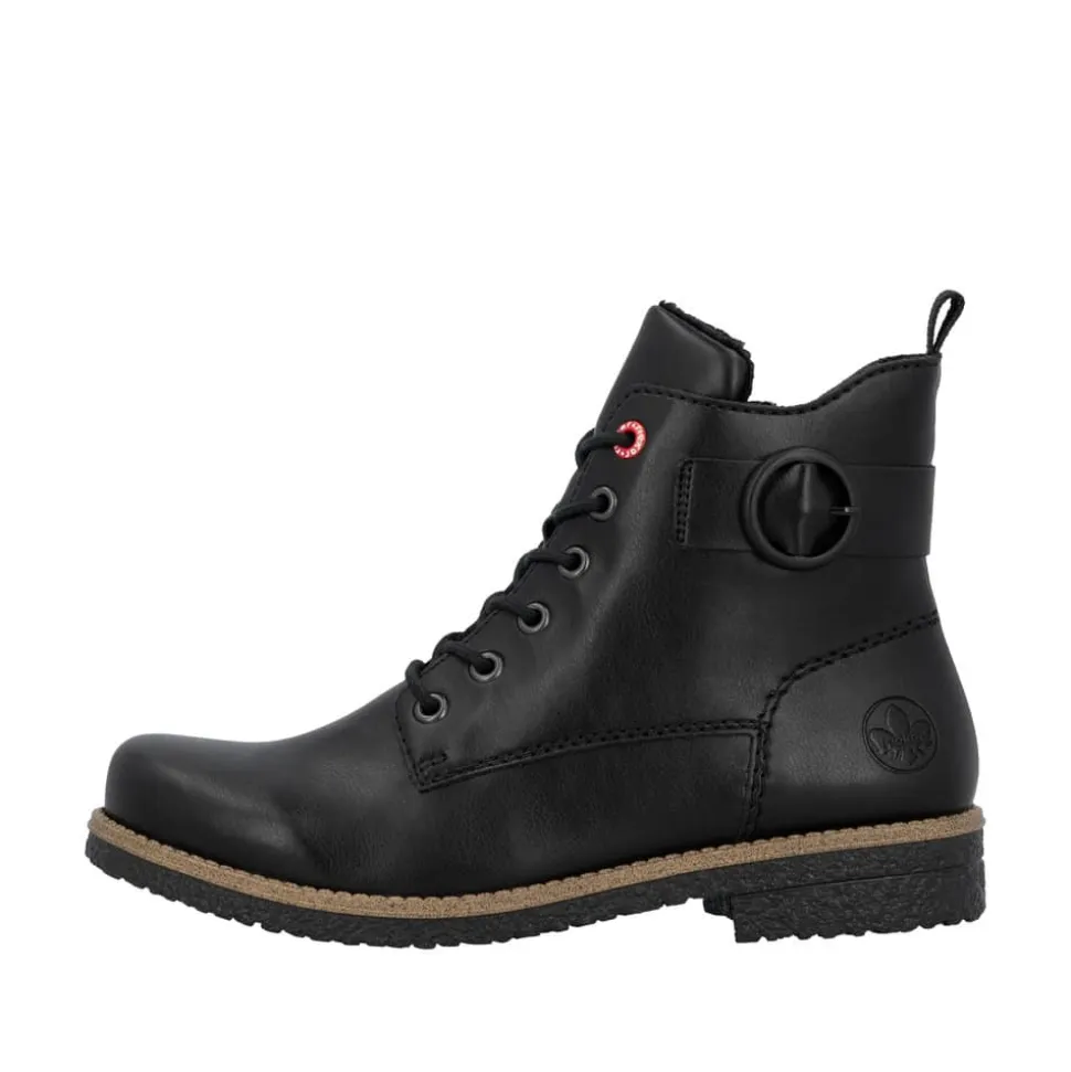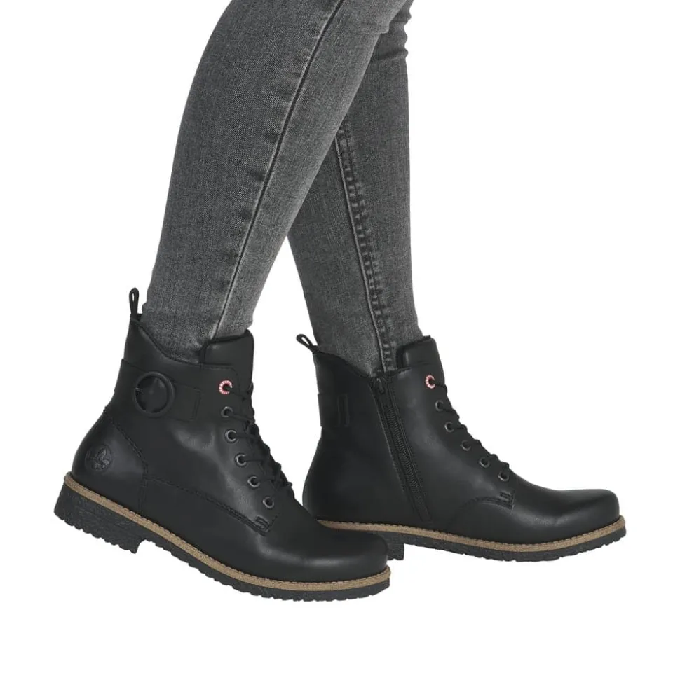 Rieker støvle til dame i sort. Flotte sorte støvler med en enkel detalje, der giver et tidløst og stilrent udtryk. Modellen har snørebånd og en praktisk lynlås, som gør det nemt at tage støvlen af og på. Indvendigt er den udstyret med en let foring og en blød indersål, der giver komfort hele dagen. Hælen på 2,5 cm giver et elegant løft. Rieker Antistress teknologien gør støvlen let og fleksibel, mens ydersålen med mønster giver øget stødabsorbering og skridsikkerhed.