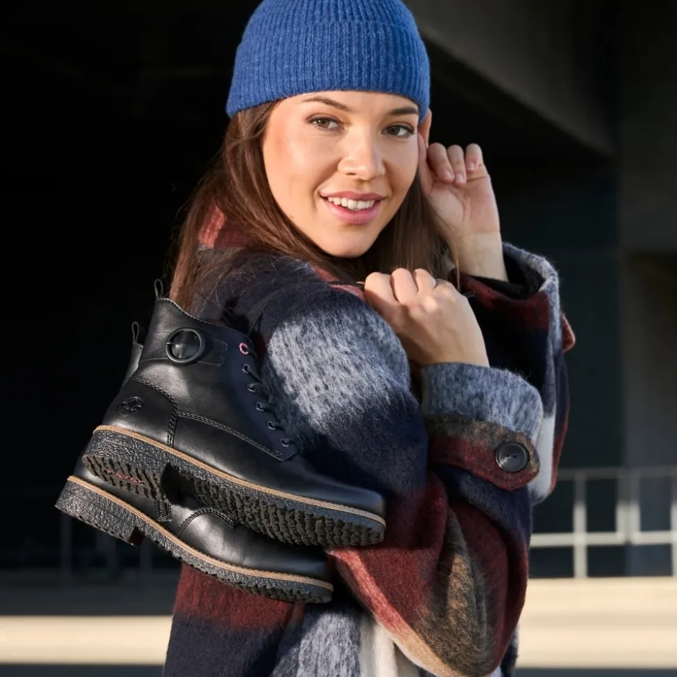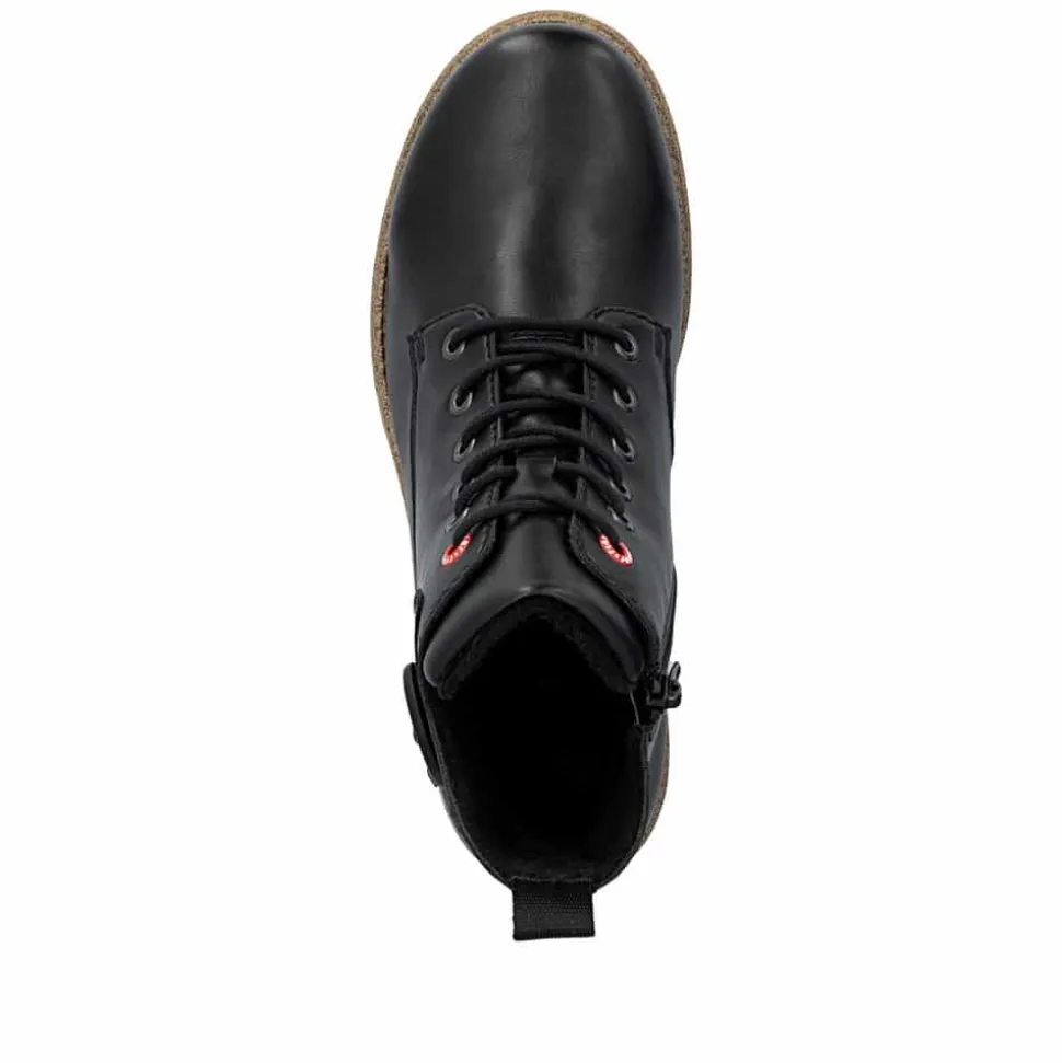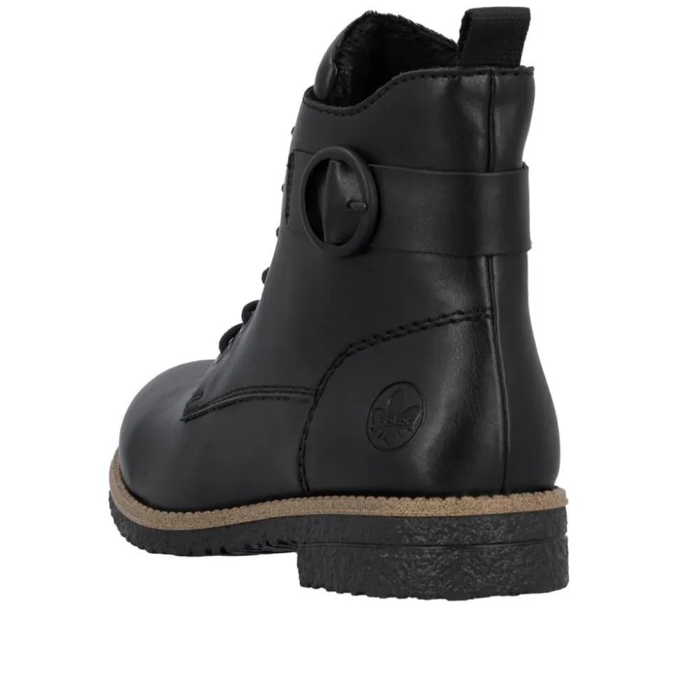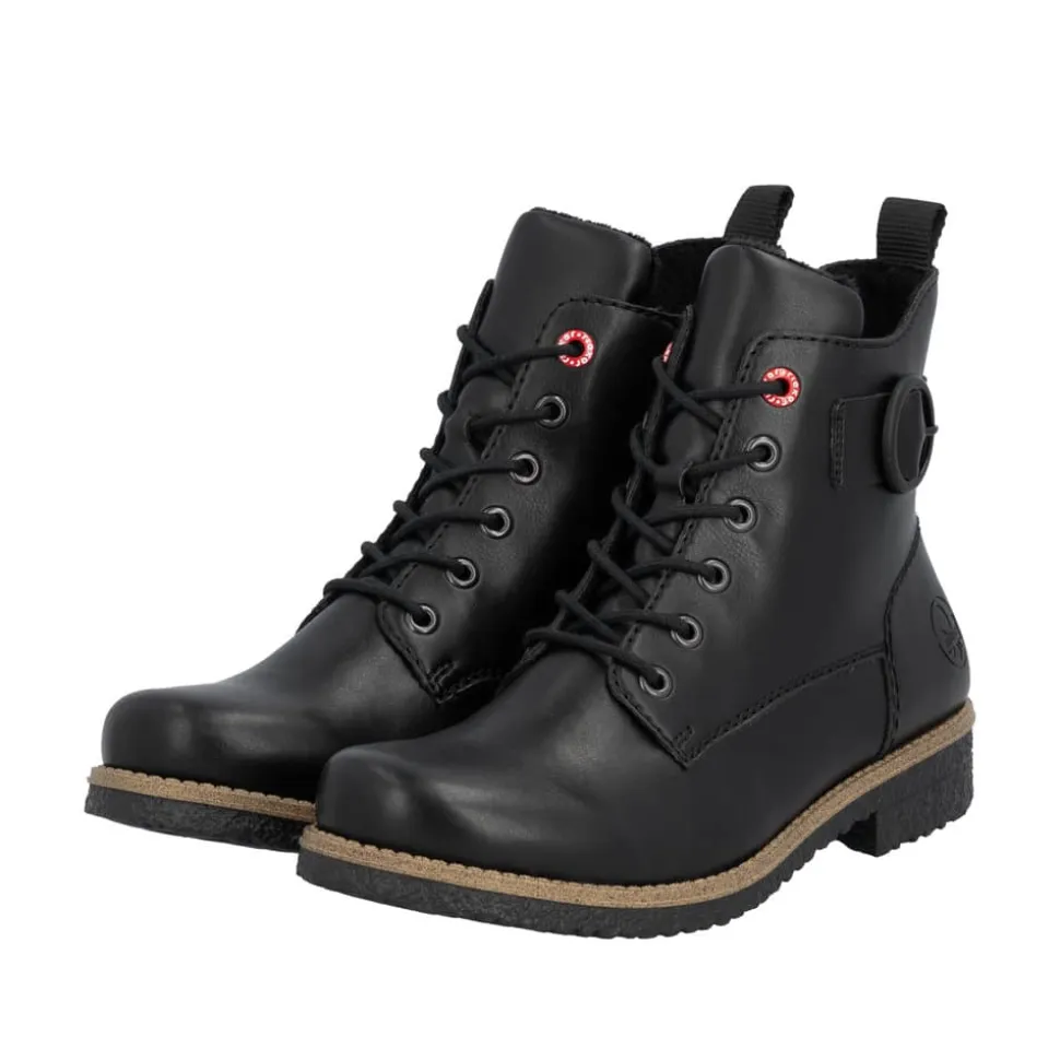 Rieker støvle til dame i sort. Flotte sorte støvler med en enkel detalje, der giver et tidløst og stilrent udtryk. Modellen har snørebånd og en praktisk lynlås, som gør det nemt at tage støvlen af og på. Indvendigt er den udstyret med en let foring og en blød indersål, der giver komfort hele dagen. Hælen på 2,5 cm giver et elegant løft. Rieker Antistress teknologien gør støvlen let og fleksibel, mens ydersålen med mønster giver øget stødabsorbering og skridsikkerhed.