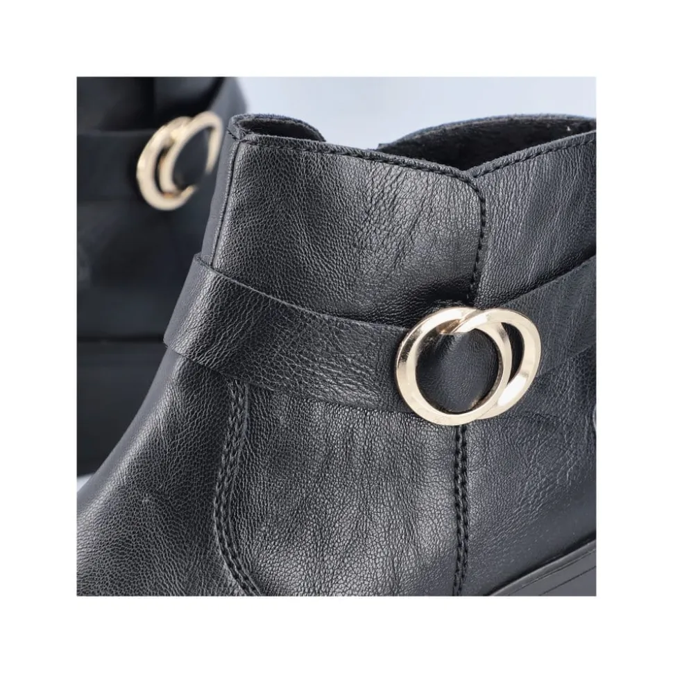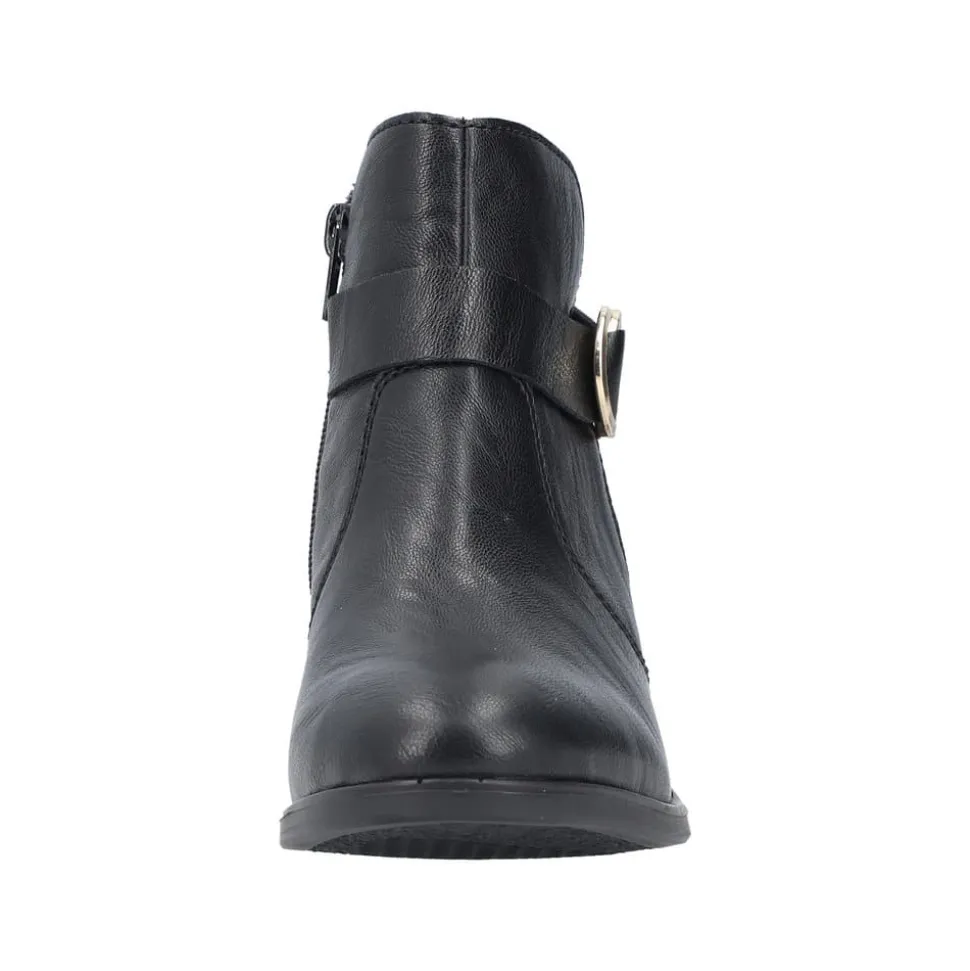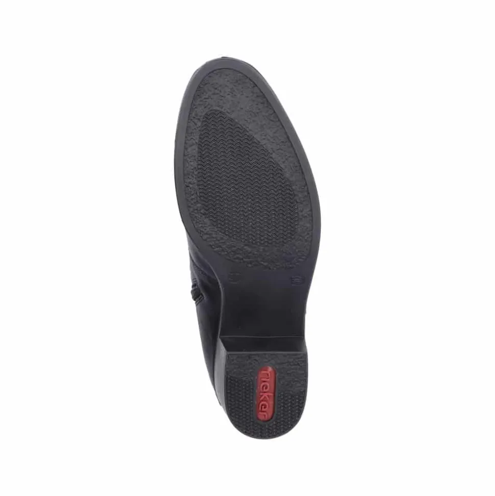 Rieker støvle til dame i sort. Oplev en elegant ankelstøvle, der kombinerer stil og komfort til perfektion. Modellen har en sort overdel med dekorative syninger og et smukt spænde omkring anklen, som tilføjer et stilfuldt udtryk. Indvendigt sikrer en blød indersål og en let foring, at støvlen føles behagelig hele dagen. Med Rieker Antistress er den både let, fleksibel og udstyret med effektiv stødabsorbering, så hvert skridt føles ekstra behageligt. Den 5 cm høje blokhæl giver et elegant løft uden at gå på kompromis med komforten.