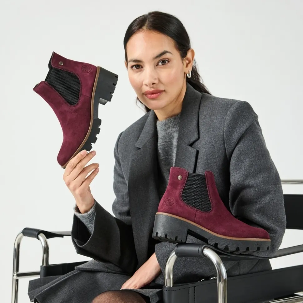 Rieker støvle til dame i bordeaux. Moderne chelseastøvle til dame i en smuk bordeaux farve med en elegant ruskindsoverdel, der tilfører et stilfuldt udtryk. Støvlen har elastik i begge sider, som sikrer en behagelig pasform og gør den nem at tage af og på. Indvendigt finder du en blød indersål og en let foring, der giver komfort hele dagen. Den solide blokhæl på 5 cm tilføjer et elegant løft, uden at gå på kompromis med komforten. Ydersålen har stødabsorberende egenskaber og et mønster, der giver øget støtte og skridsikkerhed.