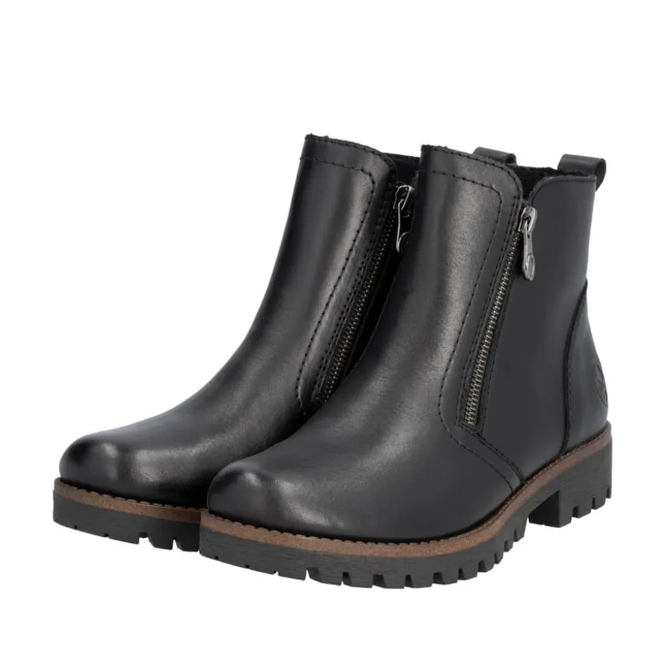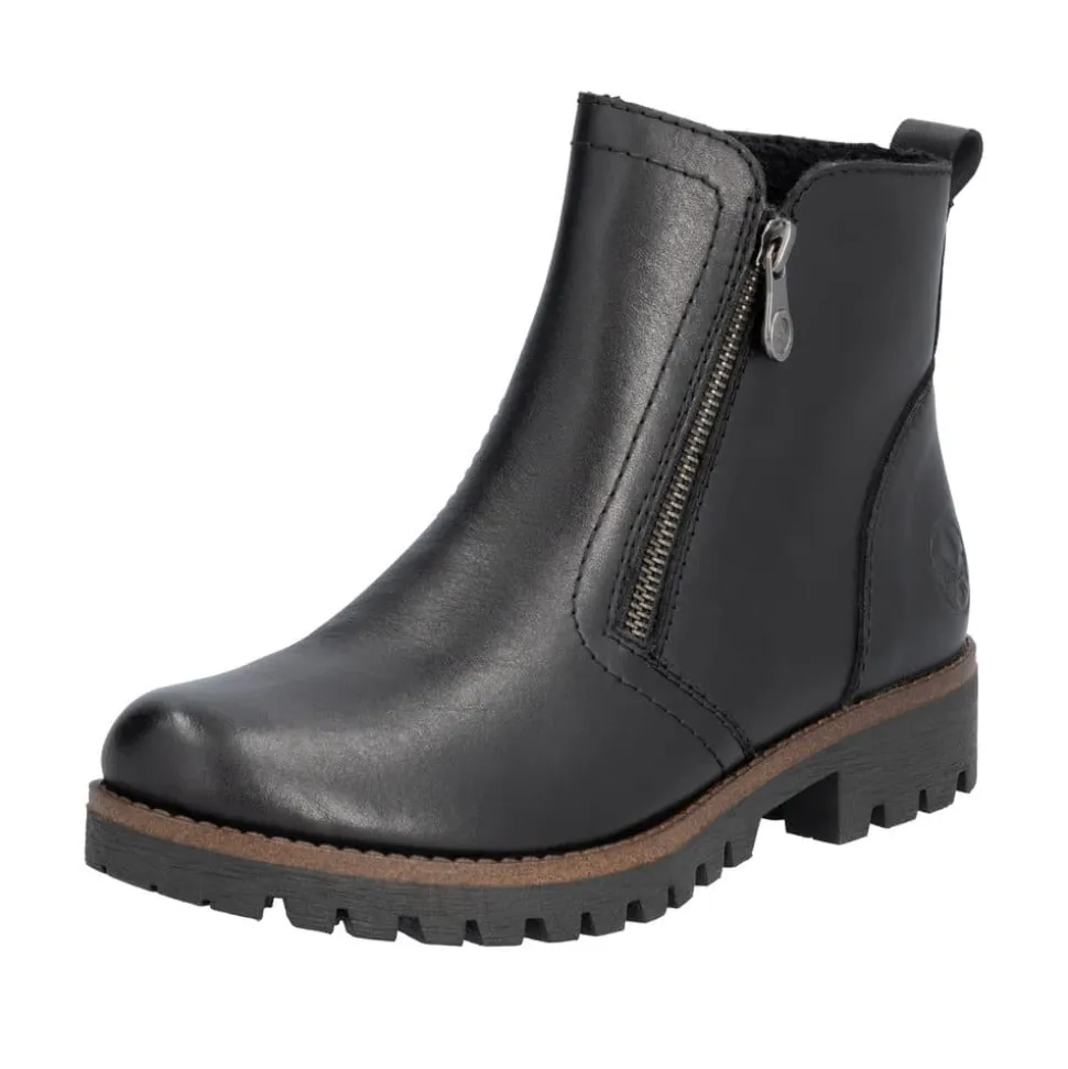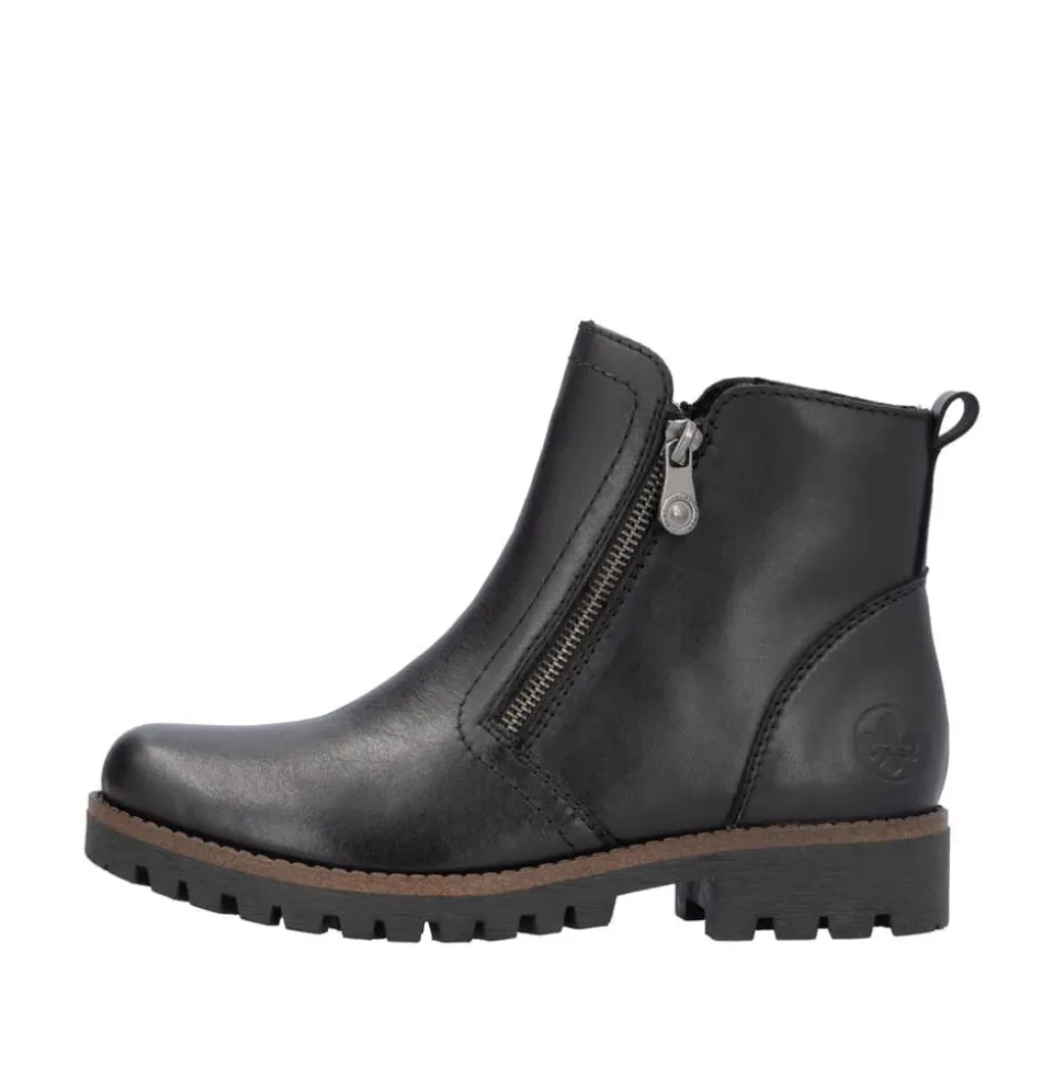 Rieker støvle til dame i sort. Stilfuld sort støvle med et klassisk udtryk og en blød skindoverdel. De to funktionelle lynlåse gør det let at komme i og af støvlen, og indvendigt sørger den lette foring og den bløde indersål for høj komfort. De stødabsorberende egenskaber giver god komfort, mens ydersålen med mønster bidrager til støtte og øget skridsikkerhed i hverdagen.
