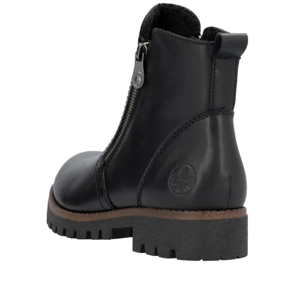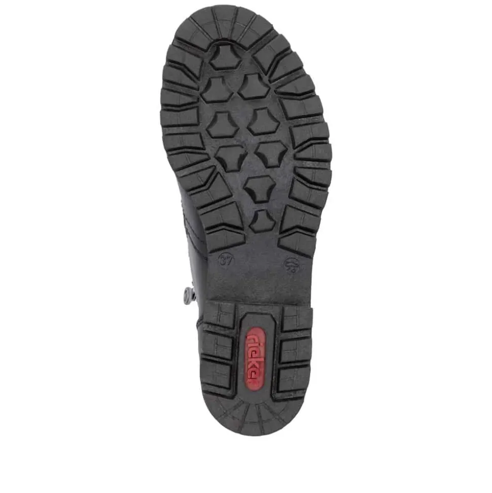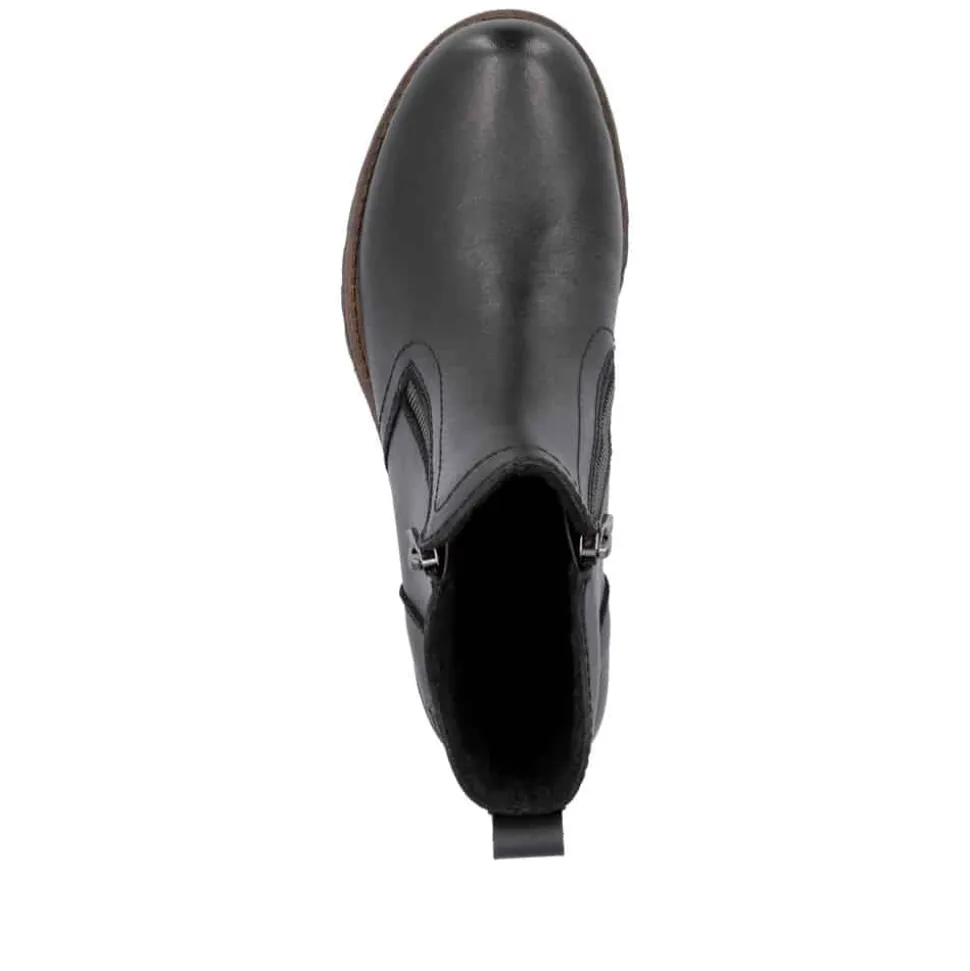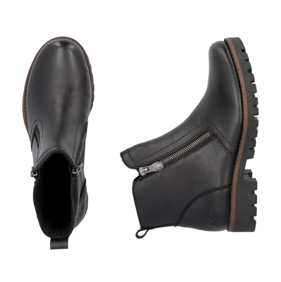 Rieker støvle til dame i sort. Stilfuld sort støvle med et klassisk udtryk og en blød skindoverdel. De to funktionelle lynlåse gør det let at komme i og af støvlen, og indvendigt sørger den lette foring og den bløde indersål for høj komfort. De stødabsorberende egenskaber giver god komfort, mens ydersålen med mønster bidrager til støtte og øget skridsikkerhed i hverdagen.