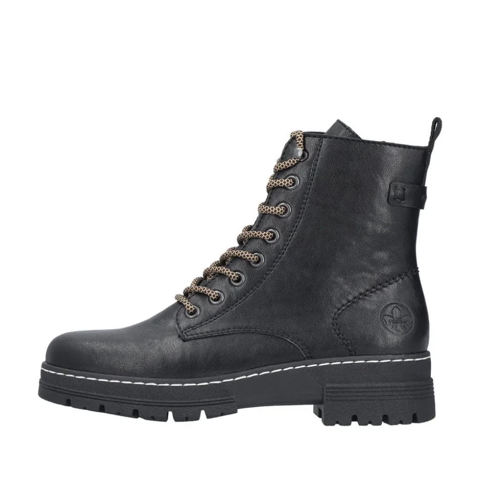 Rieker støvle til dame i sort. Denne smarte sorte støvle er et oplagt valg til hverdagen, hvor komfort og funktion er i fokus. Støvlen har snørebånd samt en funktionel lynlås, der gør det let at komme i og af støvlen og samtidig giver mulighed for at tilpasse pasformen. Indvendigt mødes du af en blød og udtagelig sål samt en let foring, som giver behagelig komfort hele dagen. Den chunky ydersål med en blokhæl på 2 cm giver et flot løft, mens mønsteret giver øget stødabsorbering og skridsikkerhed.