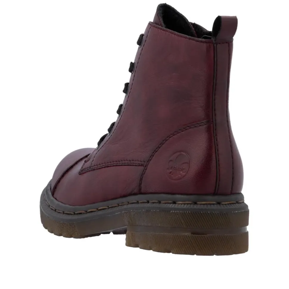 Rieker støvle til dame i bordeaux. En elegant støvle i moderne bordeaux med et enkelt, men stilfuldt look. Støvlen er fremstillet i blødt skind og udstyret med snørebånd foran samt en praktisk lynlås på indersiden, så pasformen kan tilpasses og den er nem at tage af og på. Indvendigt oplever du en behagelig kombination af en blød indersål og en let foring, der giver varme og komfort. Den fleksible ydersål er designet med stødabsorbering og et solidt mønster, som giver øget støtte og sikkerhed i hverdagen.
