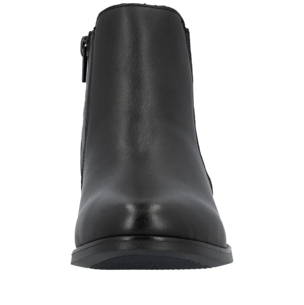 Rieker støvle til dame i sort. Moderne støvle i sort med et klassisk design og en overdel i blødt skind, der giver et stilfuldt look. Støvlen har en funktionel lynlås på indersiden og elastik på ydersiden, hvilket gør den nem at tage af og på og sikrer en behagelig pasform. Indvendigt finder du en let foring og en blød, udtagelig indersål, som giver god komfort. Den lille hæl på 3 cm tilføjer et diskret løft uden at gå på kompromis med komforten. Ydersålen er stødabsorberende og mønstret for at give øget støtte og stabilitet.