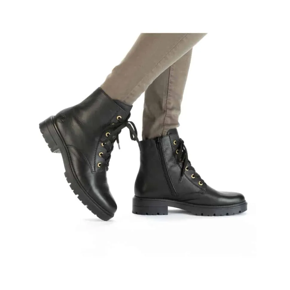 Rieker støvle til dame i sort. Denne sorte støvle i skind kombinerer moderne stil med praktiske detaljer. Støvlen har både snørebånd og en funktionel lynlås, der gør det nemt at tage den af og på, samtidig med at du kan tilpasse pasformen til din fod. Indvendigt sørger en let foring og en blød sål for behagelig komfort hele dagen. Ydersålen er mønstret og stødabsorberende, hvilket giver øget støtte og skridsikkerhed.
