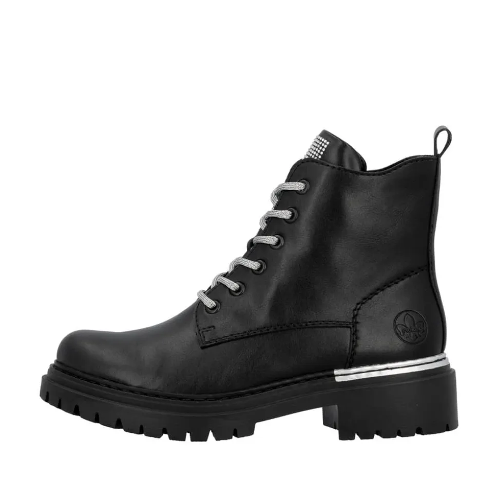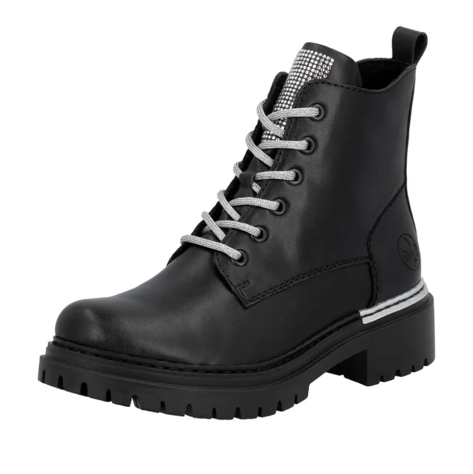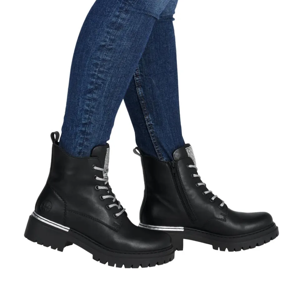 Rieker støvle til dame i sort. Stilfuld støvle til dame i en smuk sort farve med elegante sølvdetaljer, der giver et moderne udtryk. Støvlen er udstyret med snørebånd og en funktionel lynlås, som gør den nem at tage af og på, samtidig med at pasformen kan tilpasses perfekt. Indvendigt finder du en let foring og en blød indersål, der giver komfort hele dagen og holder dine fødder varme. Ydersålen på 5 cm. har stødabsorberende egenskaber og et mønster, der øger både støtte og skridsikkerhed.