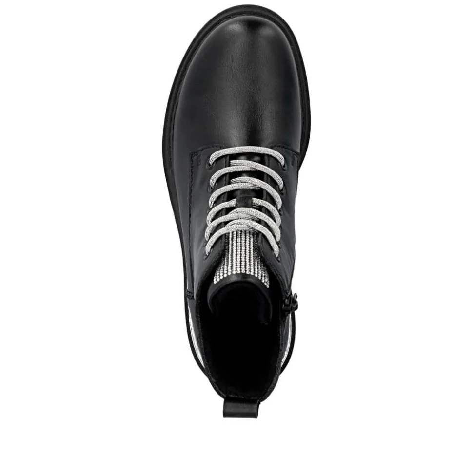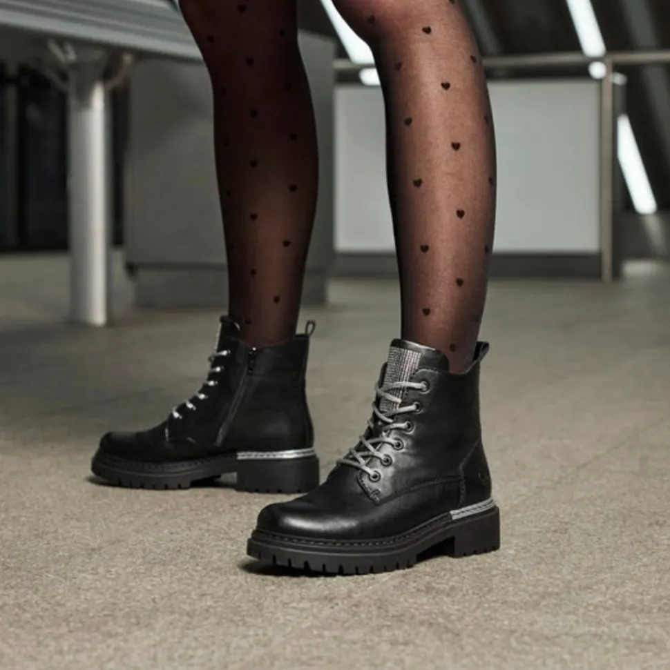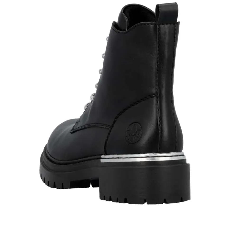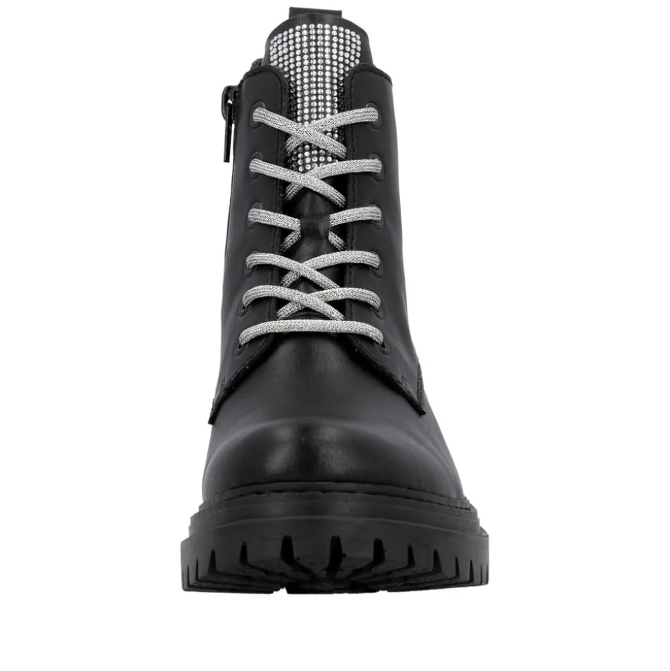 Rieker støvle til dame i sort. Stilfuld støvle til dame i en smuk sort farve med elegante sølvdetaljer, der giver et moderne udtryk. Støvlen er udstyret med snørebånd og en funktionel lynlås, som gør den nem at tage af og på, samtidig med at pasformen kan tilpasses perfekt. Indvendigt finder du en let foring og en blød indersål, der giver komfort hele dagen og holder dine fødder varme. Ydersålen på 5 cm. har stødabsorberende egenskaber og et mønster, der øger både støtte og skridsikkerhed.
