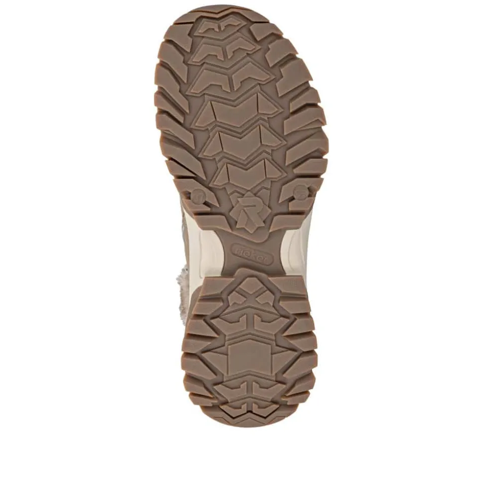Rieker støvle til dame i beige. Flot og praktisk støvle i skind, der kombinerer stil med høj komfort. Støvlen har snørebånd foran og en funktionel lynlås i siden, som gør den nem at tage af og på, samtidig med at pasformen kan justeres. Indvendigt finder du en blød udtagelig sål og en varm foring, der holder fødderne lune hele dagen. Rieker-Tex gør støvlen kraftig vandafvisende, mens den mønstrede ydersål giver både øget stødabsorbering og skridsikkerhed.