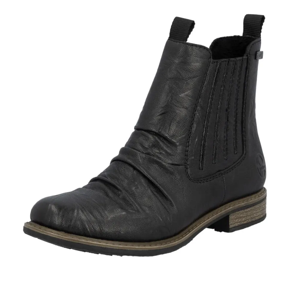 Rieker støvle til dame i sort. En stilfuld støvle i sort med rynkede detaljer, der giver et tidløst og feminint look. Overdelen er i skind, og støvlen har elastik på ydersiden og lynlås på indersiden, som gør den let at tage på og giver en god pasform. Indvendigt er der en let foring og en blød, udtagelig indersål med ekstra bredde H, som giver maksimal komfort og ekstra plads. Rieker Tex gør støvlen kraftigt vandafvisende, mens hælen på 2,5 cm tilfører et elegant løft. Den stødabsorberende ydersål med mønster giver øget støtte og skridsikkerhed.
