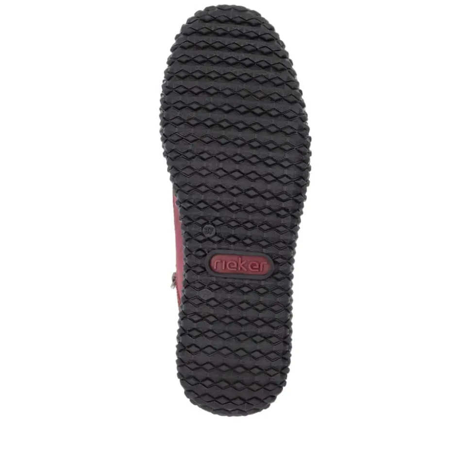 Rieker støvle til dame i rød. Denne lette og fleksible støvle i en moderne rød farve kombinerer stil og funktionalitet. Med både snørebånd og to lynlåse er det hurtigt og nemt at få støvlen af og på. Den lette foring gør den perfekt til brug hele året. Takket være Rieker-Tex er støvlen kraftig vandafvisende, så du kan bruge den i al slags vejr uden bekymring. Den ikoniske Rieker sål med stødabsorbering og et skridsikkert mønster sikrer både komfort og stabilitet.