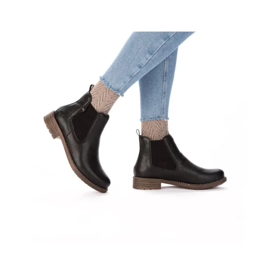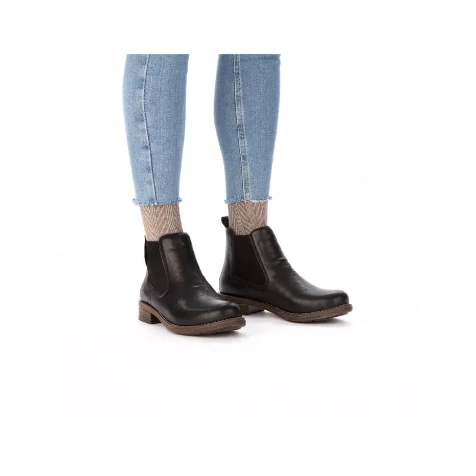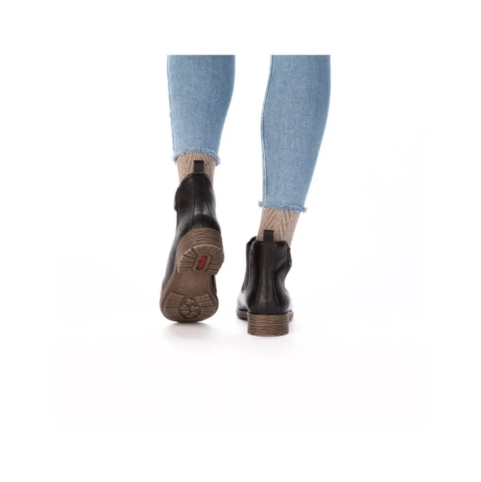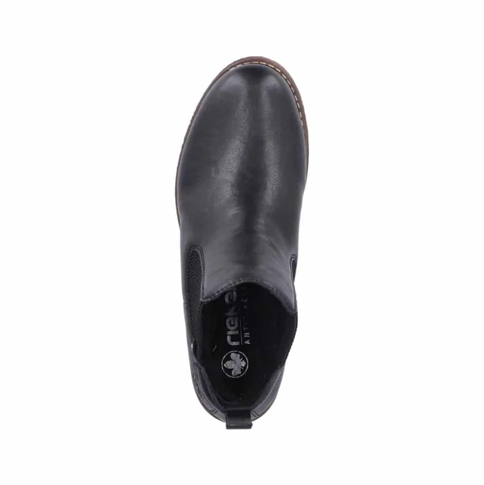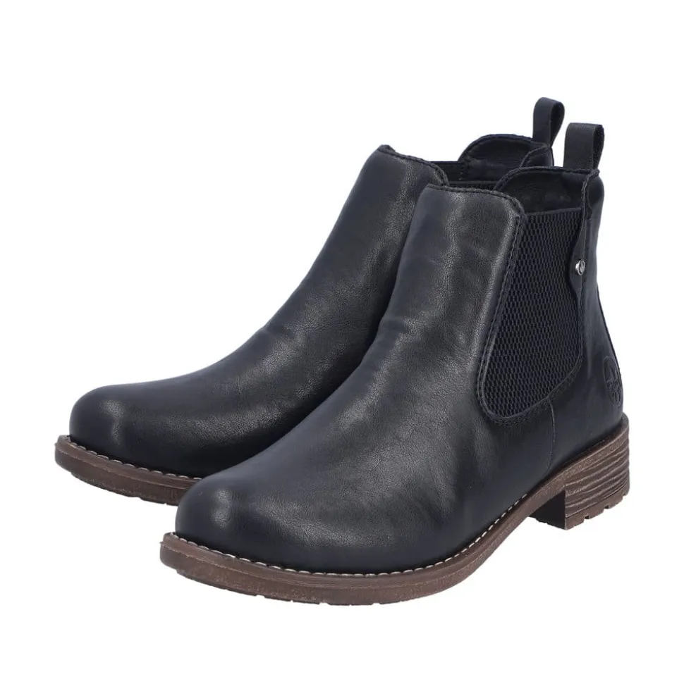 Rieker støvle til dame i sort. Klassisk sort chelseastøvle med elastik i begge sider, som gør den nem at tage af og på. De enkle detaljer giver støvlen et tidløst og stilfuldt udtryk. Indvendigt sørger den varme foring og den bløde, udtagelige indersål for behagelig komfort hele dagen. Den lille blokhæl på ca. 3 cm giver et elegant løft, mens de stødabsorberende egenskaber sikrer ekstra komfort ved hvert skridt.