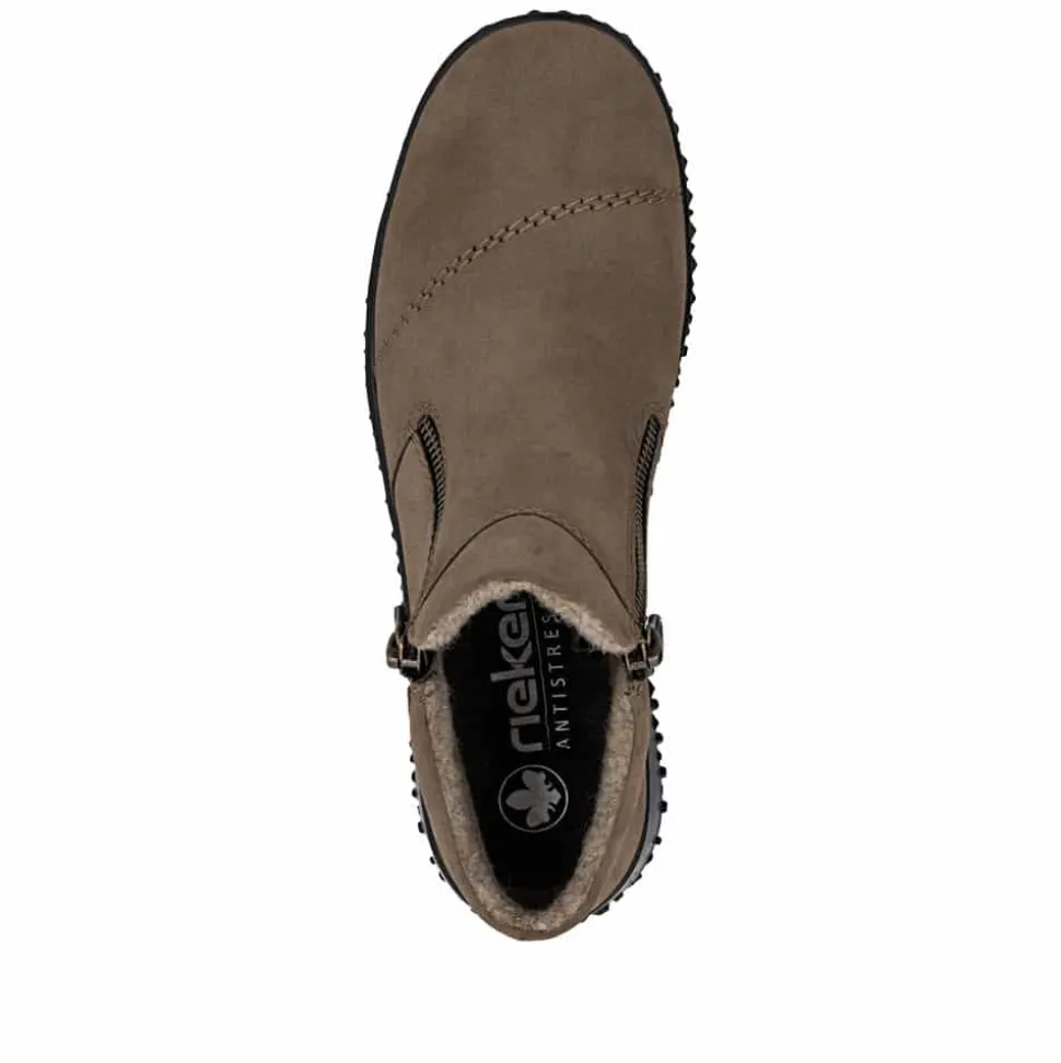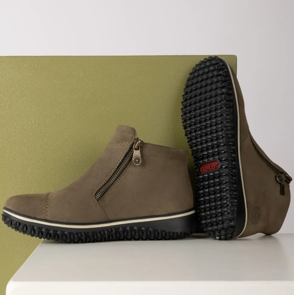 Rieker støvle til dame i brun. Denne støvle er perfekt til hverdagen og kombinerer praktiske detaljer med høj komfort. Modellen har to funktionelle lynlåse, der gør modellen nem at tage af og på. Indvendigt finder du en blød indersål og en varm foring, som giver behagelig komfort hele dagen. Rieker-Tex gør støvlen kraftigt vandafvisende, mens den mønstrede ydersål øger både stødabsorbering og skridsikkerhed.