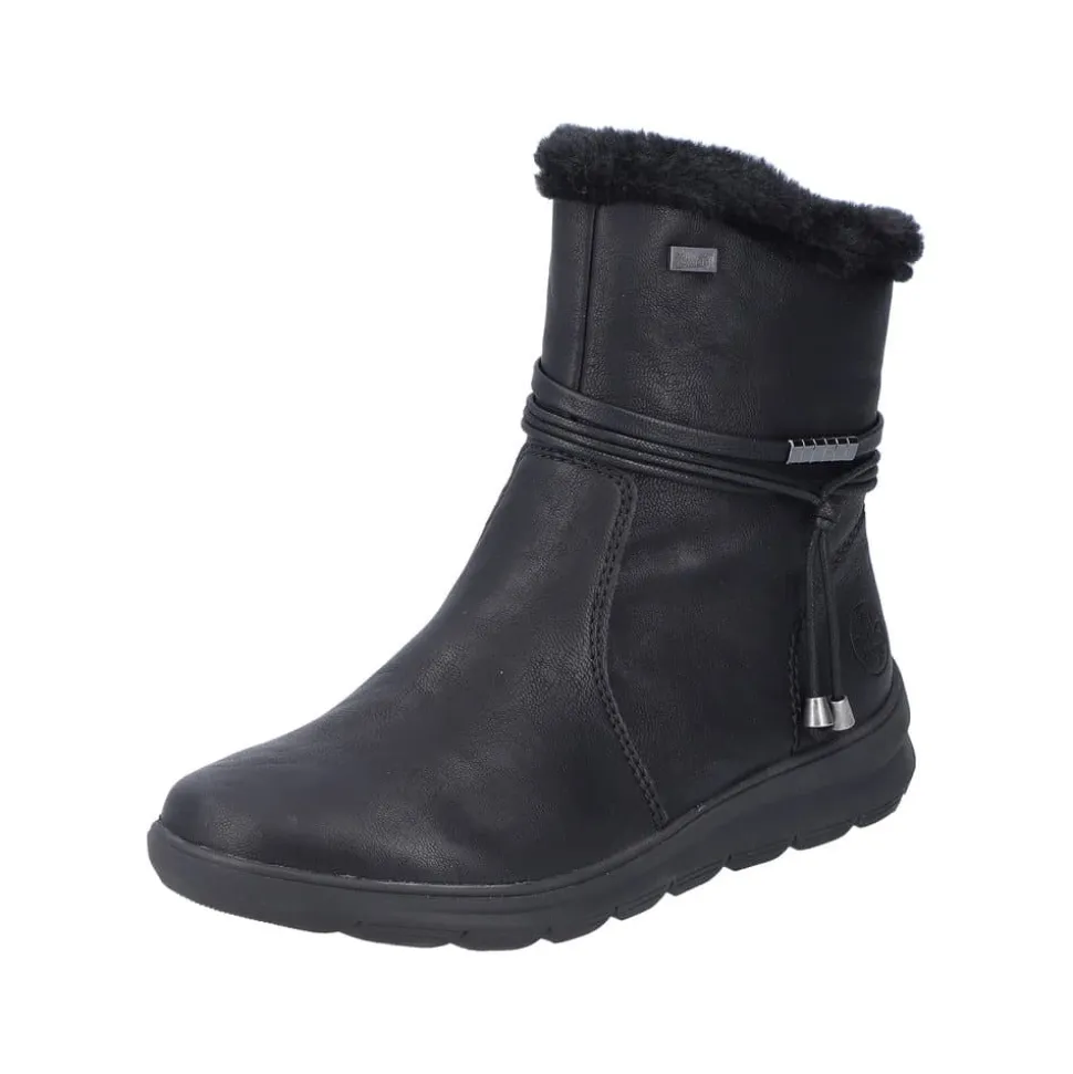 Rieker støvle til dame i sort. Stil og komfort mødes i disse sorte ankelstøvler til kvinder. Lynlåsen gør det nemt og hurtigt at tage støvlerne af og på, mens den pelsbeklædte kant giver et elegant touch. Indvendigt finder du en blød og udtagelig indersål samt en varm foring, der holder fødderne behageligt lune. Med Rieker Tex får du kraftig vandafvisning, og den stødabsorberende ydersål med et godt mønster giver øget støtte og skridsikkerhed.