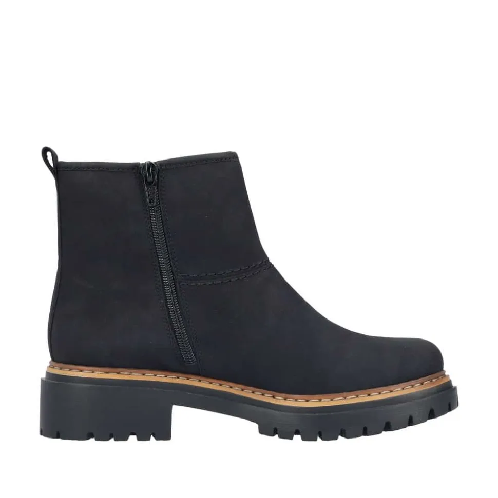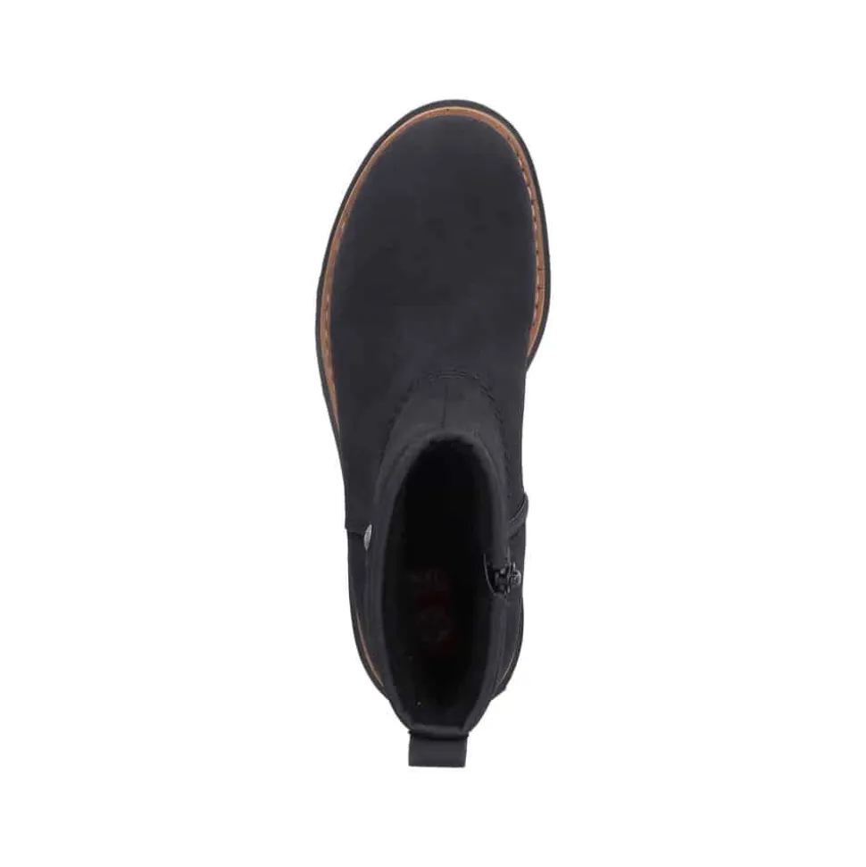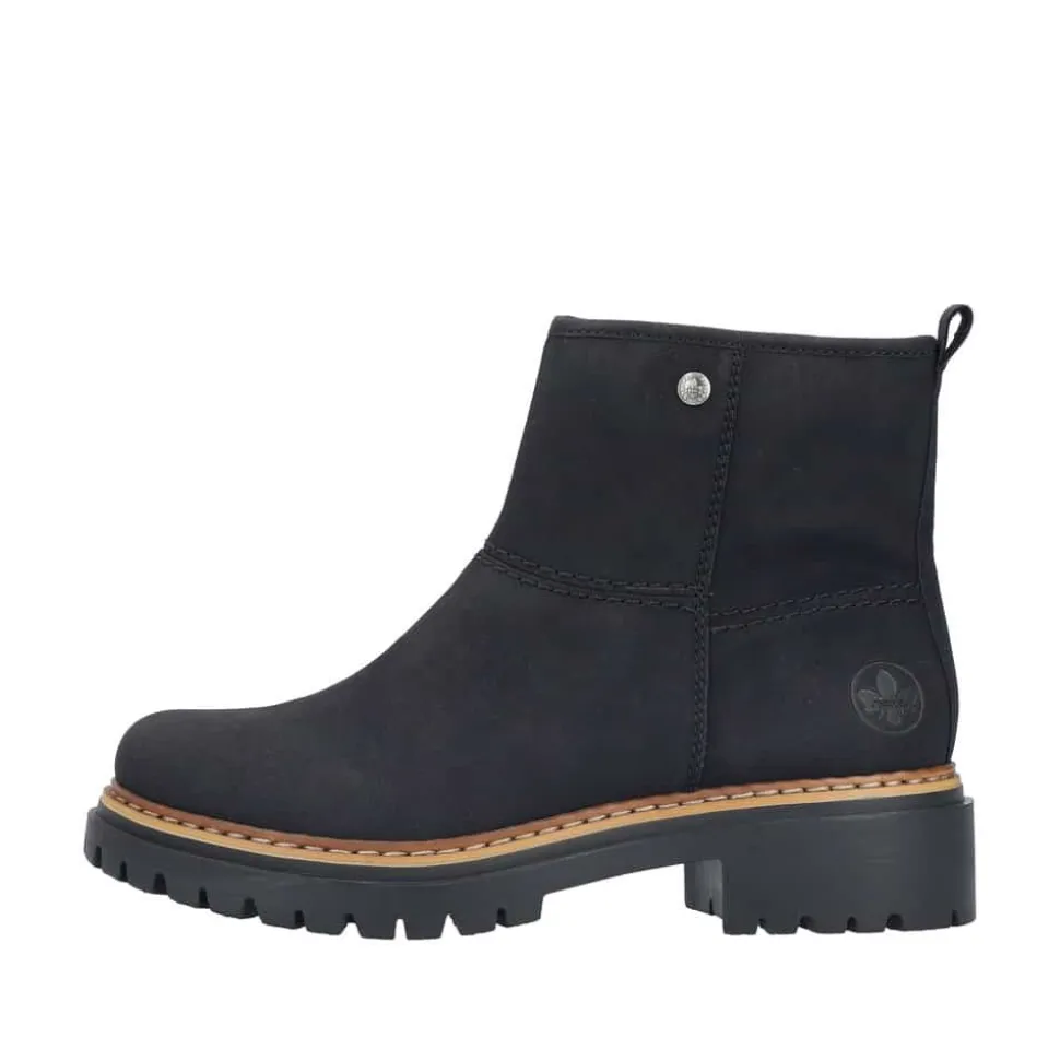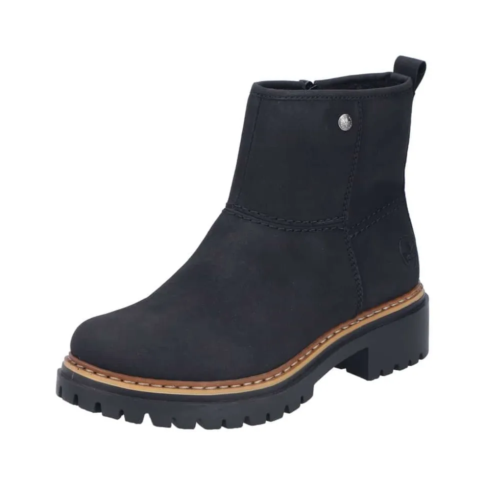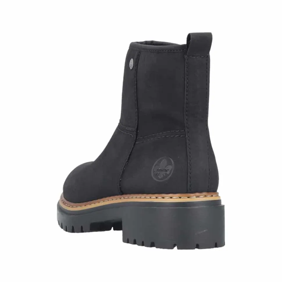 Rieker støvle til dame i sort. Populær ankelstøvle i klassisk sort med et enkelt design, der giver et elegant strejf af stil. Den funktionelle lynlås på indersiden gør det nemt at tage støvlen af og på. Indvendigt finder du en blød indersål og en varm foring, som holder fødderne behageligt lune. Den chunky ydersål på cirka 4 cm har stødabsorberende egenskaber, der giver ekstra støtte, mens det mønstrede design øger skridsikkerheden.