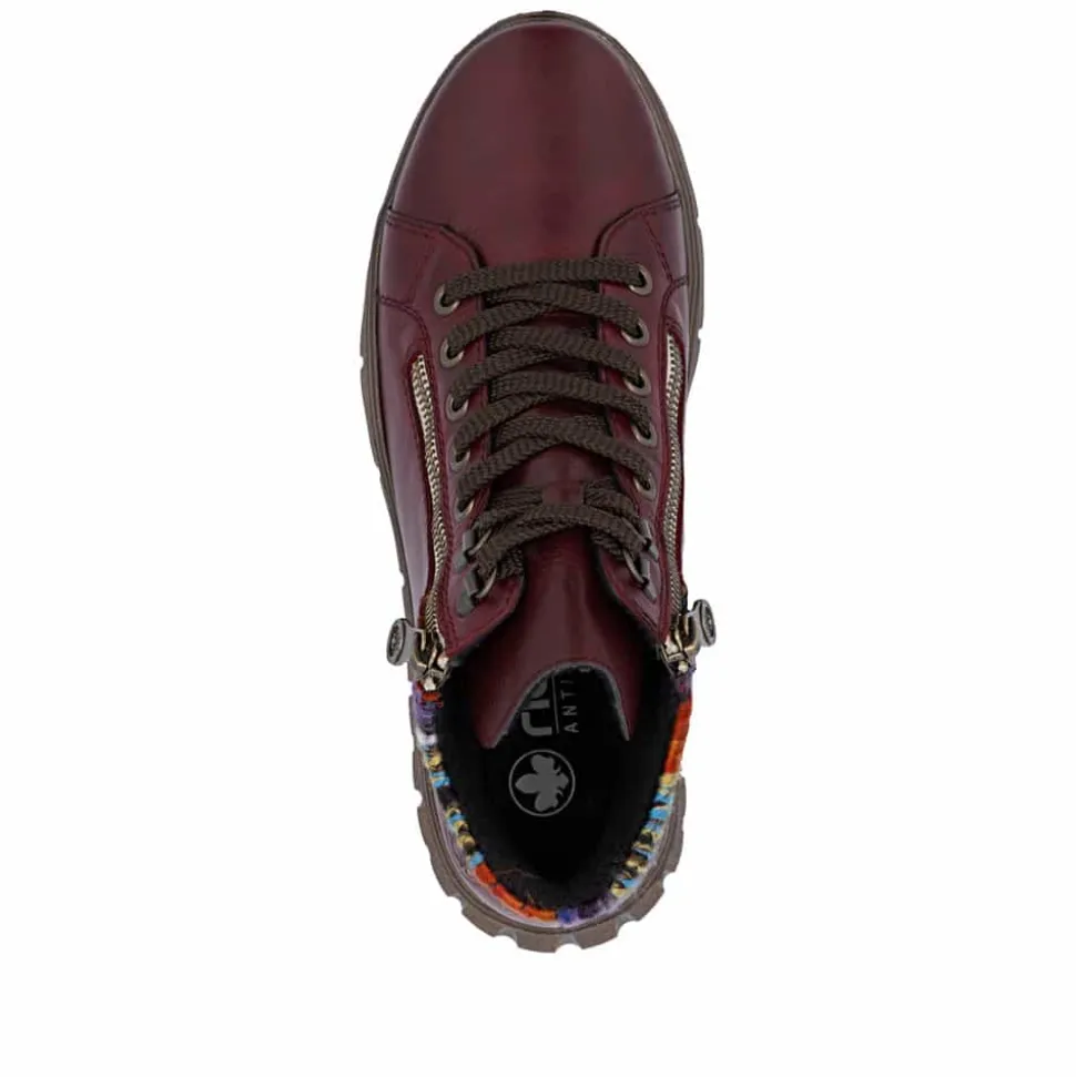 Rieker støvle til dame i bordeaux. Denne støvle kombinerer flot design med praktiske detaljer. Støvlen er udstyret med snørebånd og to funktionelle lynlåse, så du nemt kan tilpasse pasformen til din fod. Indvendigt sørger en varm foring og en blød udtagelig sål for høj komfort, mens ekstra bredde (H) giver mere plads og fleksibilitet til foden. Rieker-Tex gør støvlen kraftig vandafvisende, og den mønstrede ydersål giver både øget stødabsorbering og skridsikkerhed.