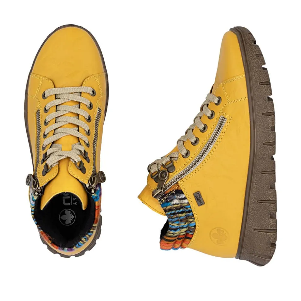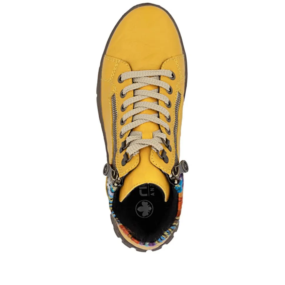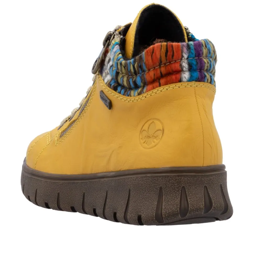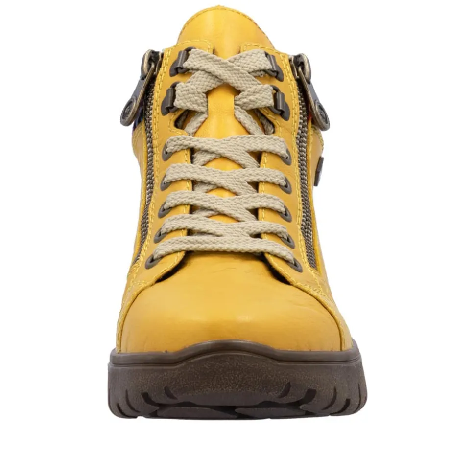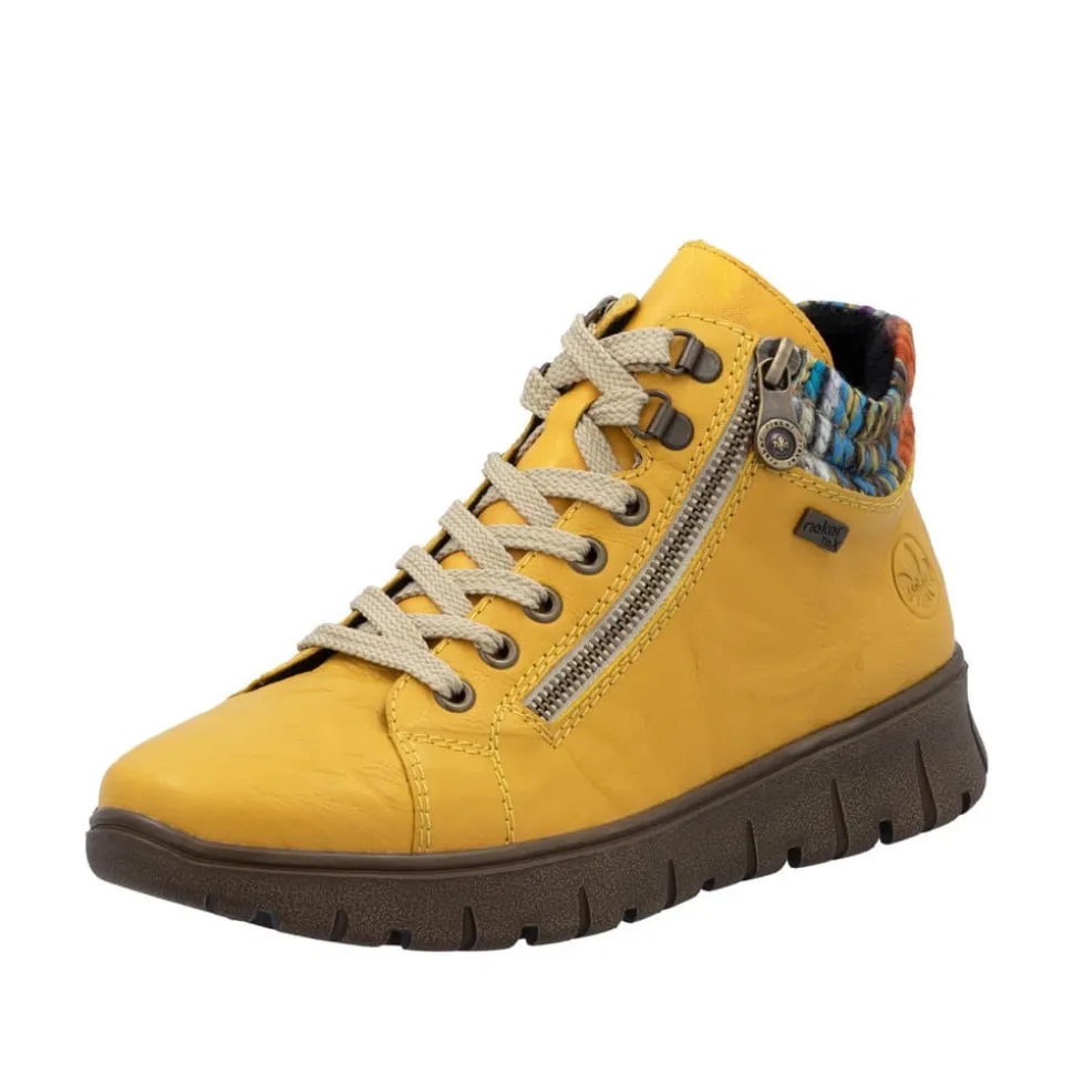 Rieker støvle til dame i gul. Flot støvle i skind, designet med fokus på både udseende og komfort. Støvlen har snørebånd og to funktionelle lynlåse, som gør det hurtigt og nemt at komme i og af. Indvendigt sørger en blød udtagelig sål og en varm foring for, at fødderne har det behageligt hele dagen. Rieker-Tex beskytter gør støvlen kraftig vandafvisende, og den mønstrede ydersål giver øget stødabsorbering og skridsikkerhed.