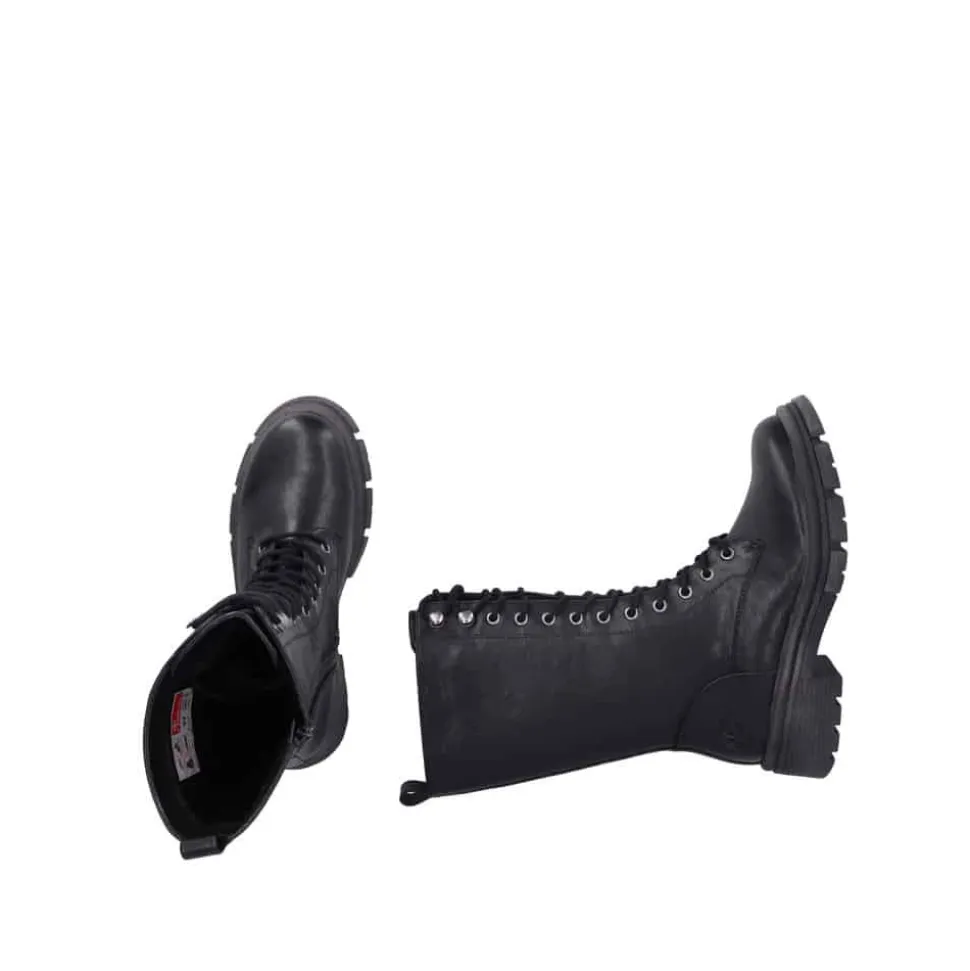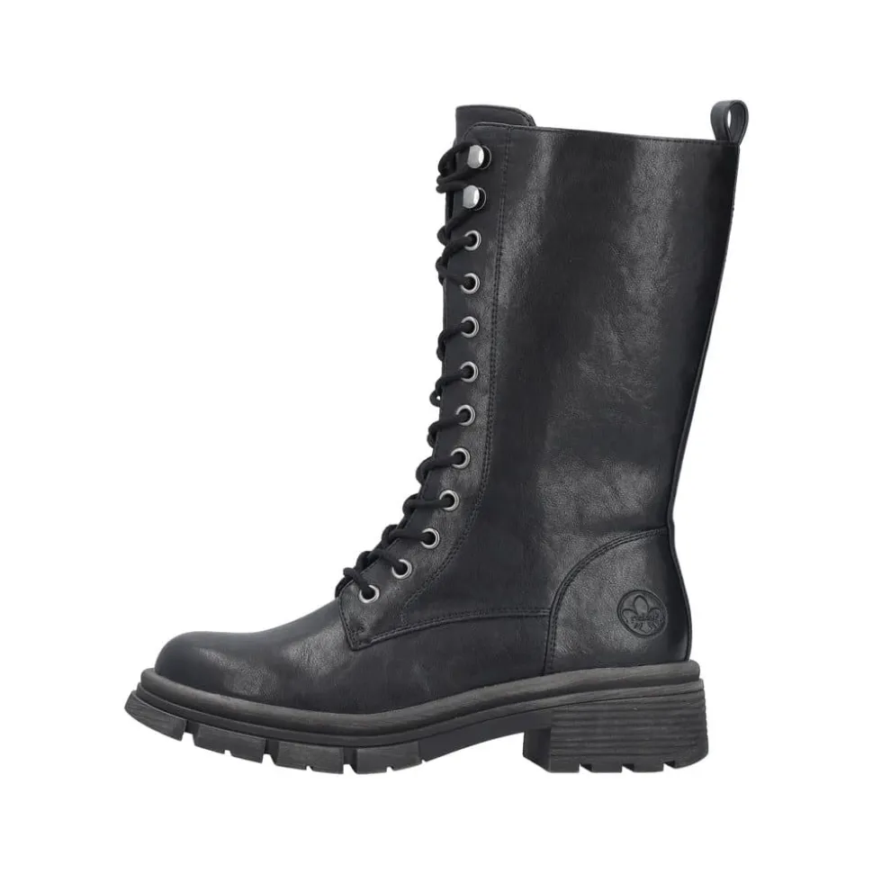 Rieker støvle til dame i sort. Flot støvle i klassisk sort, der kombinerer stil med praktiske funktioner. Modellen er udstyret med snørebånd og en funktionel lynlås, som gør den nem at tage af og på. Indvendigt giver en varm foring og en blød sål for høj komfort gennem hele dagen. Den chunky ydersål fuldender designet og giver både øget stødabsorbering og skridsikkerhed.