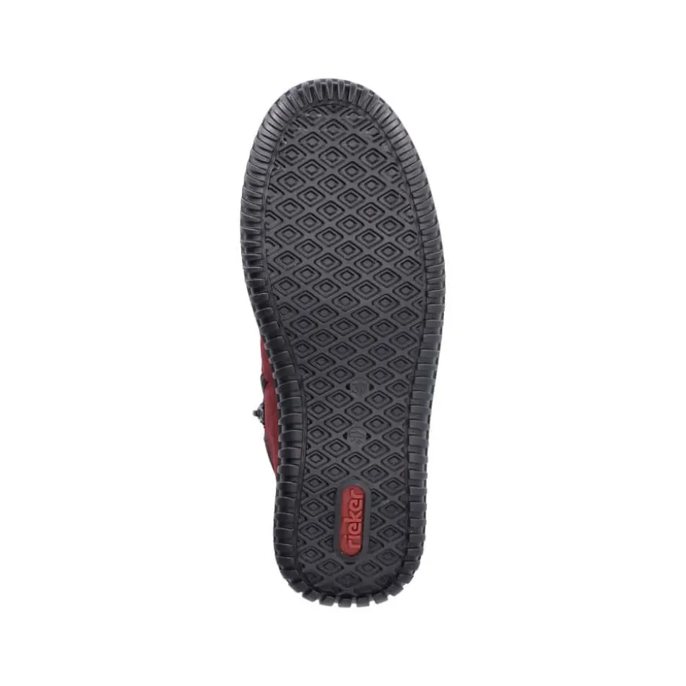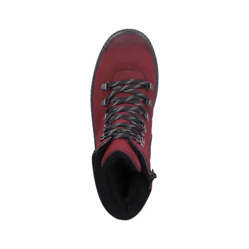 Rieker støvle til dame i rød. Denne støvle kombinerer stil og komfort perfekt med sin smukke røde farve og fine detaljer. Den er udstyret med en praktisk lynlås på indersiden samt snørebånd foran, som gør det hurtigt og nemt at tage støvlen på og af. Indvendigt har støvlen en varm foring, der holder fødderne lune på kolde dage. Udvendigt beskytter Rieker-Tex mod fugt og gør støvlen ekstra vandafvisende, så fødderne holdes tørre i al slags vejr. Indersålen er blød, kan tages ud og sikrer optimal komfort, mens den robuste ydersål med stødabsorbering giver støtte hele dagen.