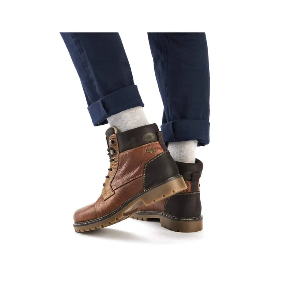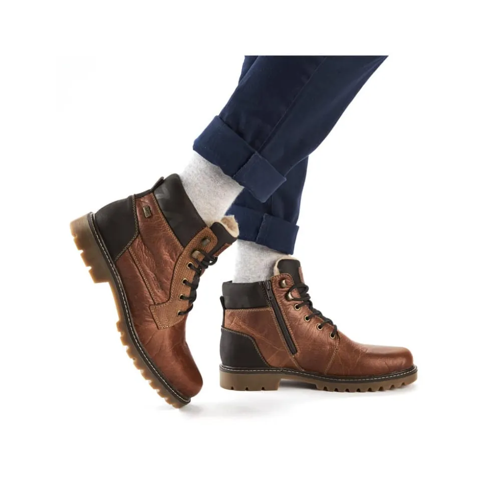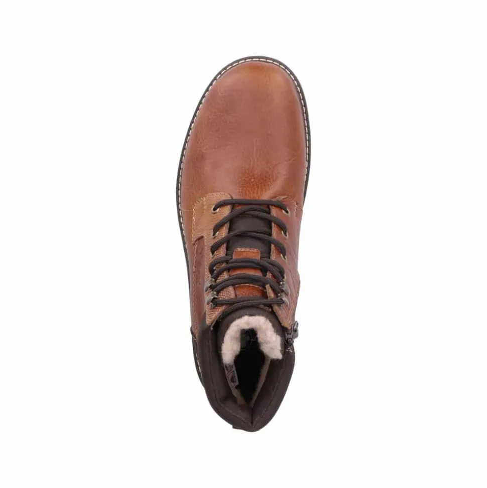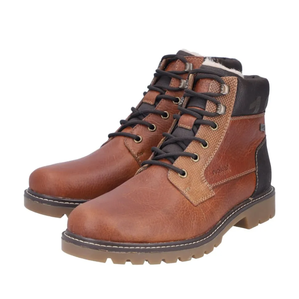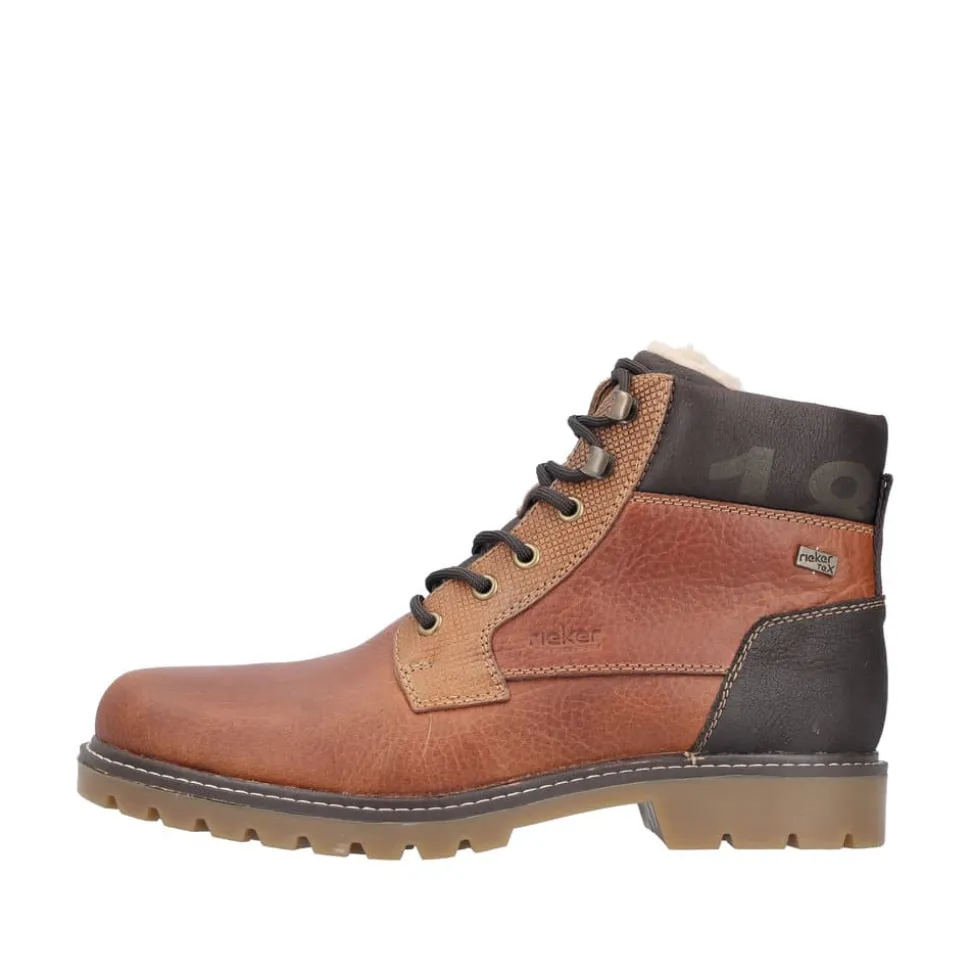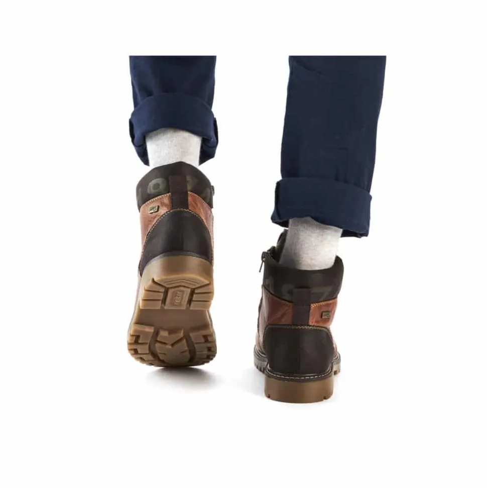 Rieker støvle til herre i brun. Smart og praktisk støvle i en flot brun farve med en overdel af skind, der kombinerer komfort og funktionalitet. Støvlen er udstyret med snørebånd foran samt en funktionel lynlås på indersiden, der gør det nemt og hurtigt at komme i og af den. Snørebåndene sikrer en optimal pasform, imens den skridsikrer ydersål sikrer øget skridsikkerhed og optimal komfort med dens stødabsorberende egenskaber. Indvendigt bliver du mødt af en blød indersål og en dejlig varm foring, der holder dine fødder varme. Med RiekerTEX er den støvle også vandafvisende.