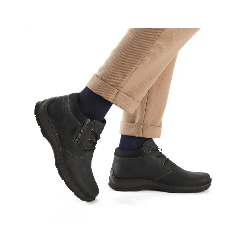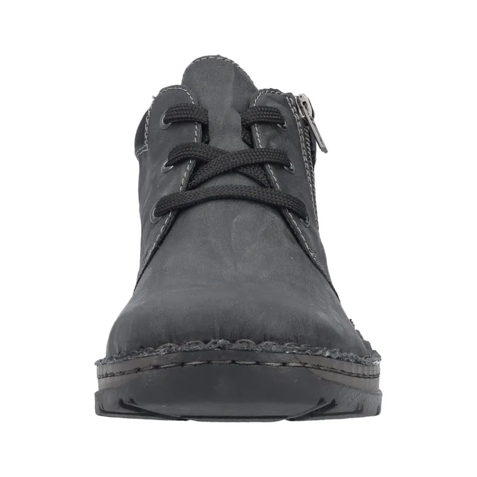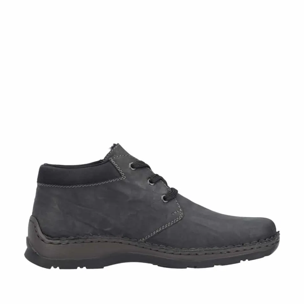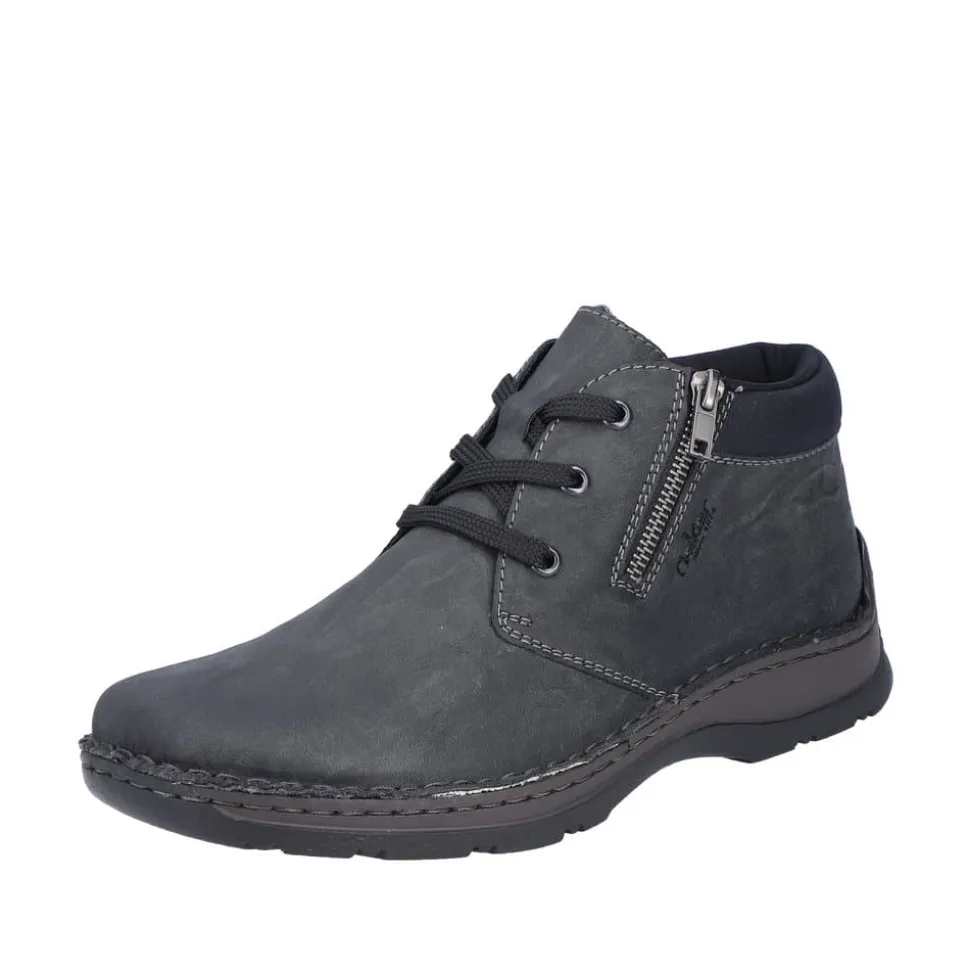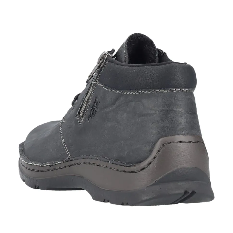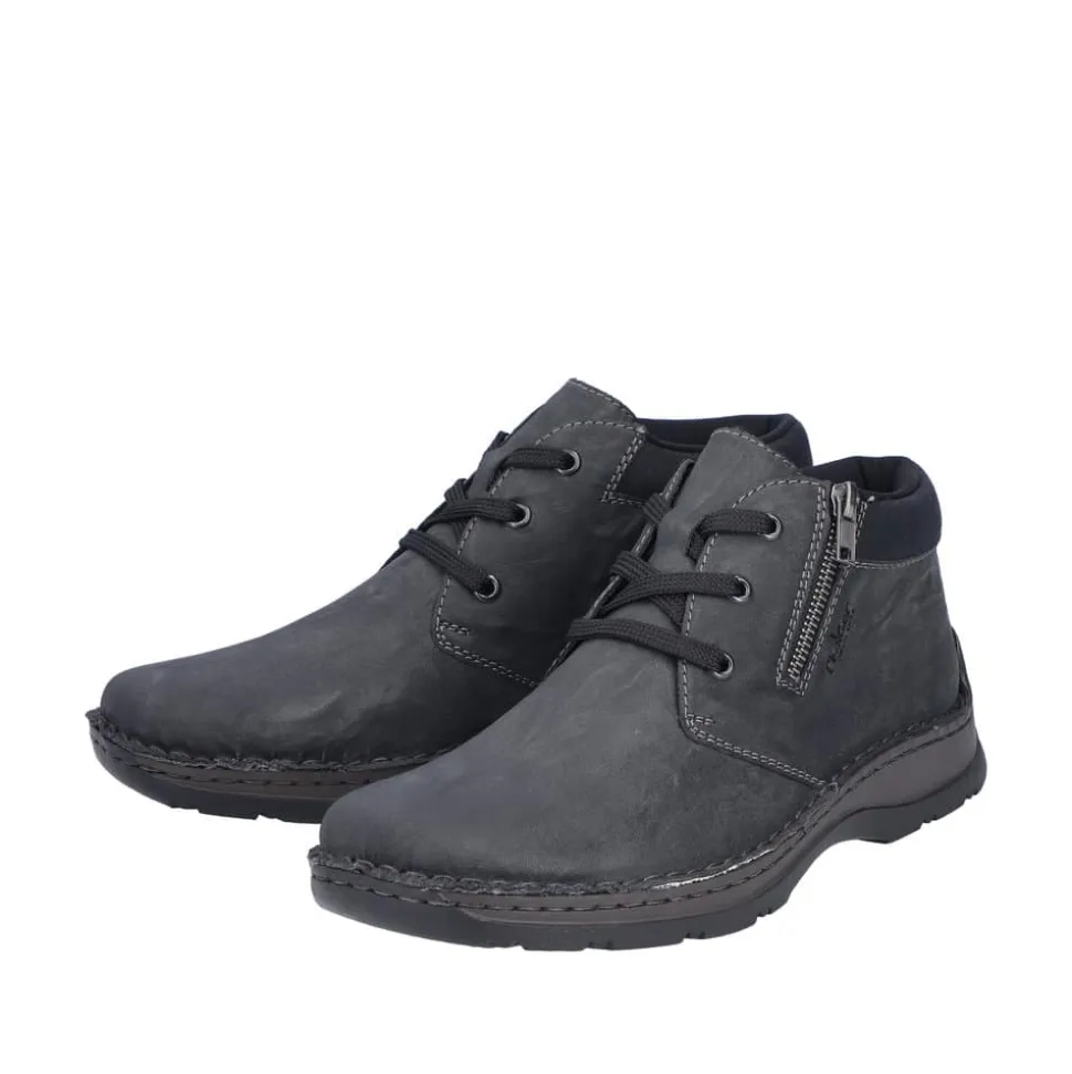Rieker støvle til herre i grå. Flot og klassisk herrestøvle i sort med et tidløst design. Støvlen har snørebånd og en lille lynlås i siden, som gør det nemt at tage støvlen af og på. Indvendigt finder du en blød sål og en varm foring, der giver komfort hele dagen, mens den ekstra bredde (H) sikrer en rummelig pasform. Ydersålen med mønster giver øget stødabsorbering og skridsikkerhed.
