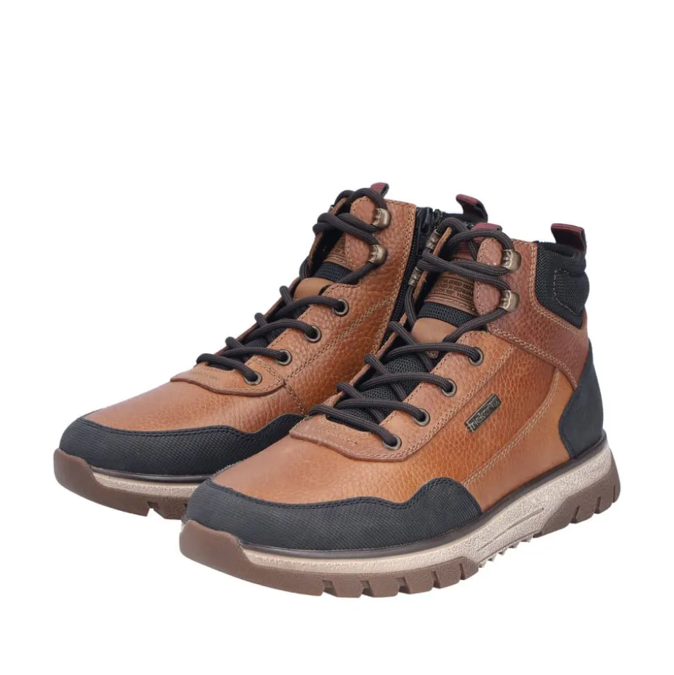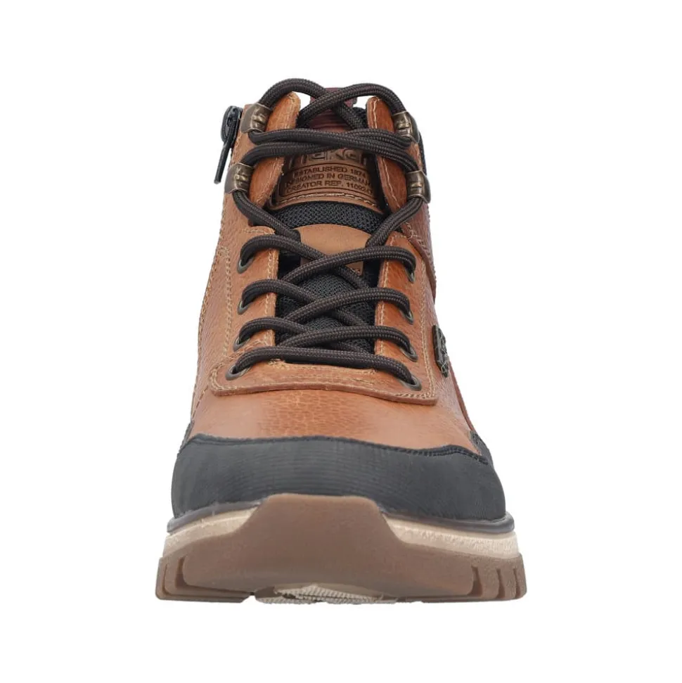 Rieker støvle til herre i brun. Stil og komfort går hånd i hånd med denne praktiske skindstøvle. Modellen er designet med både snørebånd og lynlås, så støvlen er let at tage på og samtidig kan du tilpasse pasformen. Indvendigt finder du en blød udtagelig sål og varm foring samt ekstra bredde (H), som giver en god komfort. Støvlen er udstyret med Rieker-Tex der gør modellen kraftig vandafvisende, mens den mønstrede ydersål giver øget stødabsorbering og skridsikkerhed.
