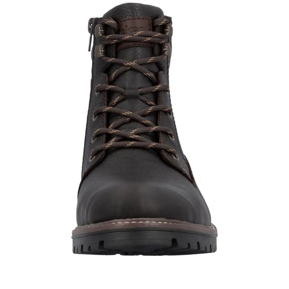 Rieker støvle til herre i mørkebrun. En flot mørkebrun vinterstøvle i skind med praktiske og stilfulde detaljer. Snørebåndene foran giver mulighed for at justere pasformen, og lynlåsen på indersiden gør støvlen let at tage på. Indvendigt finder du en varm uldforing og en blød indersål med ekstra bredde G, som sikrer komfort og rummelighed. Rieker-Tex gør støvlen kraftigt vandafvisende, mens den slidstærke ydersål med stødabsorbering og mønster giver øget skridsikkerhed og støtte på vinterens underlag.