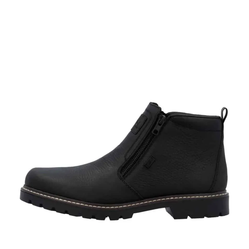Rieker støvle til herre i sort. Moderne vinterstøvle i sort med klassiske detaljer og en skindoverdel, der giver et stilrent udtryk. Støvlen er udstyret med to funktionelle lynlåse, som gør den nem at tage af og på. Indvendigt sørger en blød indersål og en varm foring for høj komfort og lune fødder i den kolde tid. Pasformen er rummelig med ekstra bredde G, og Rieker-Tex giver kraftig vandafvisning. Med en solid Fiber-Grip ydersål der er udstyret med stødabsorbering og et godt mønster, får du øget skridsikkerhed og støtte.