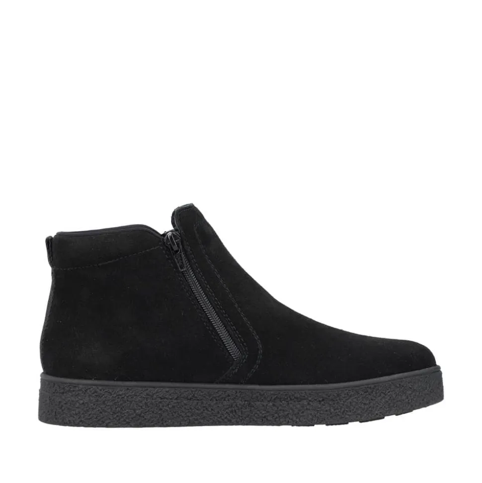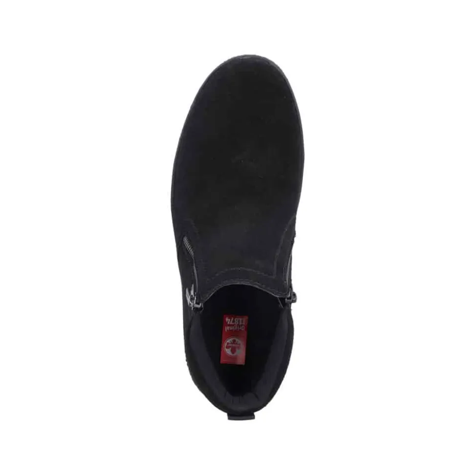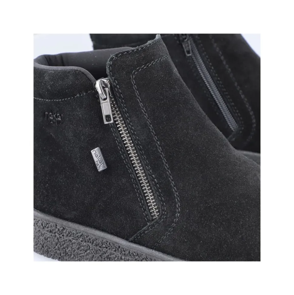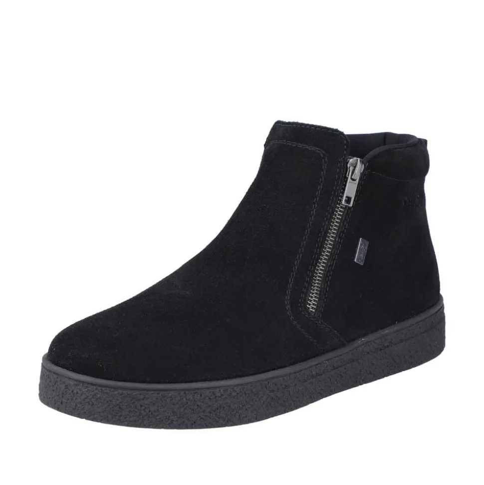 Rieker støvle til herre i sort. Disse sorte herrestøvler i ruskind har den perfekte kombination af komfort, funktion og stil. En praktisk lynlås på indersiden gør dem lette at tage af og på, mens den lette og stødabsorberende sål, sikrer komfort og stabilitet ved hvert skridt. Den bløde indersål og rummelige pasform med en bredde på H, sikrer optimal komfort dagen lang. Fødderne holdes varme takket være det bløde og varme uldforing, og Rieker-Tex giver kraftig vandafvisning.