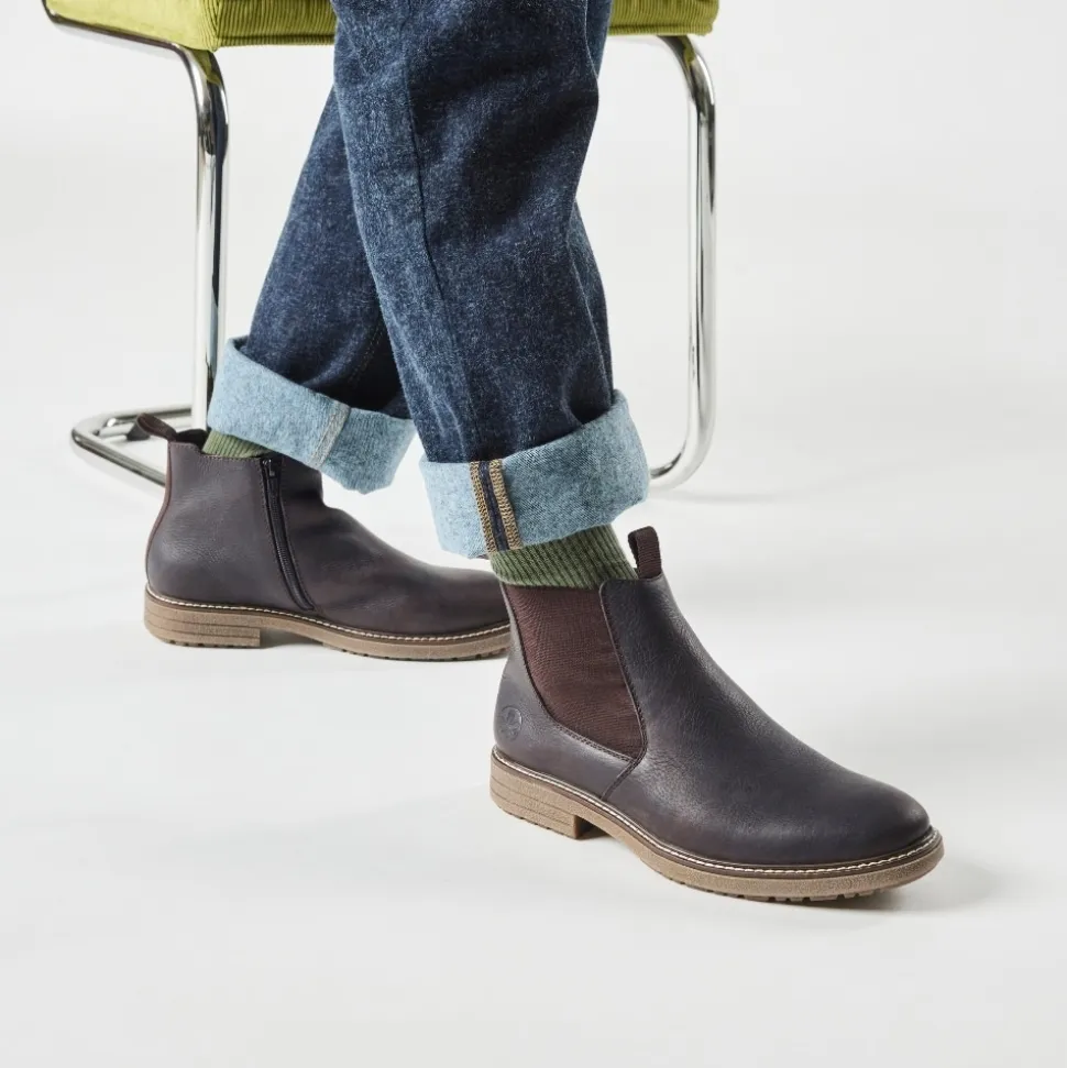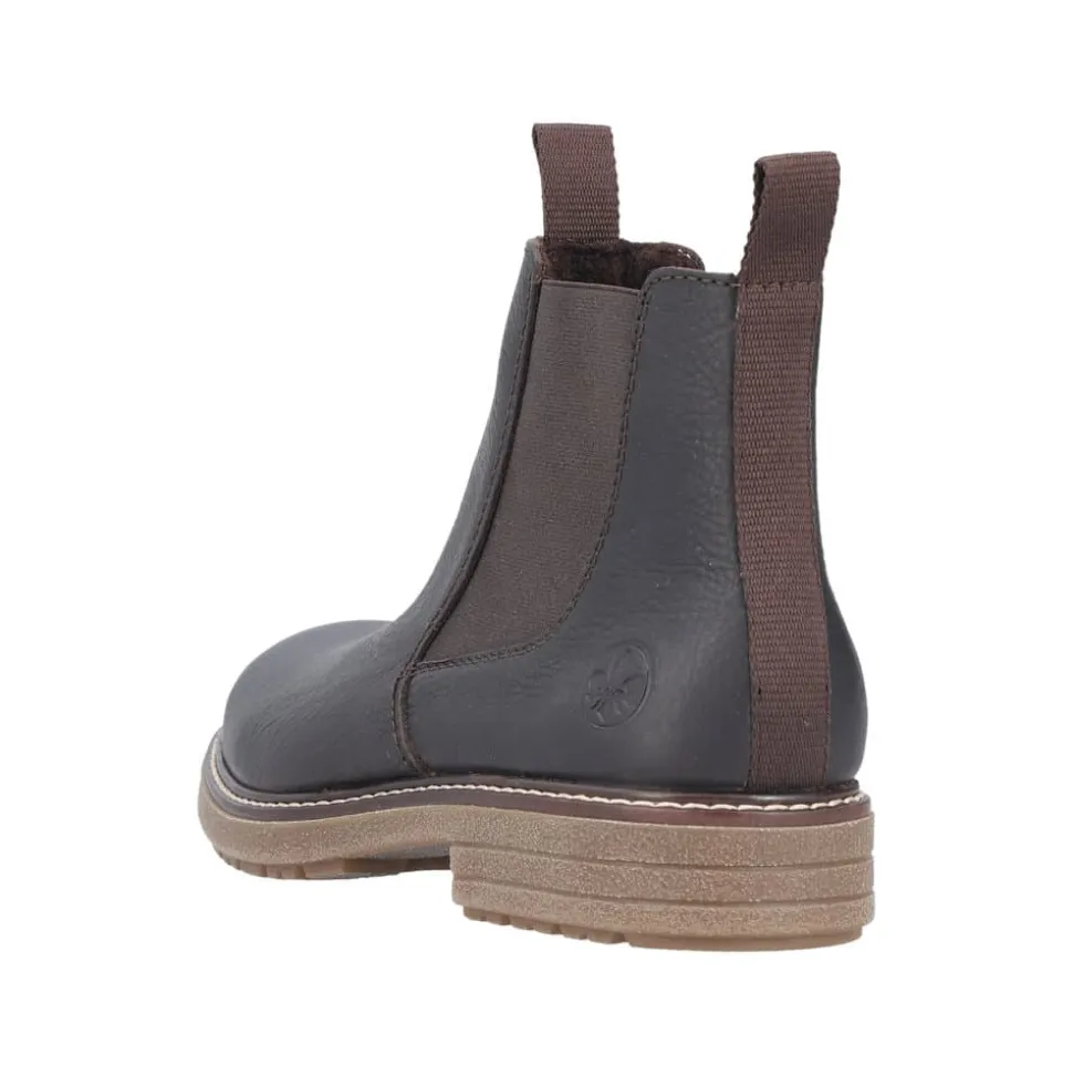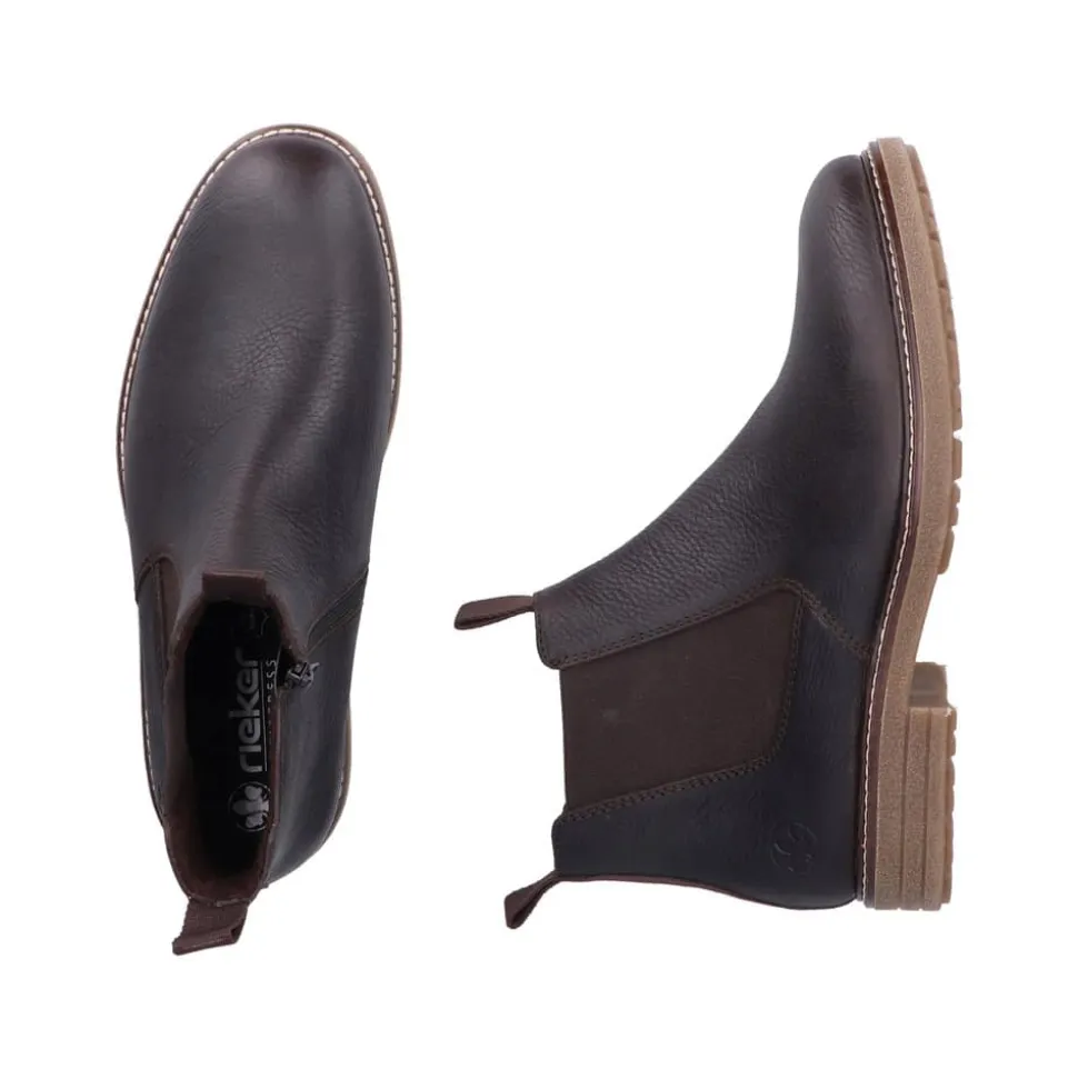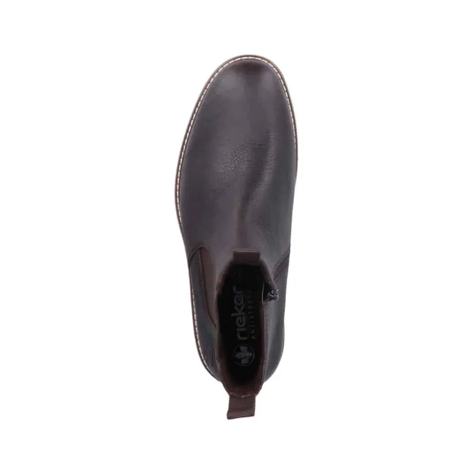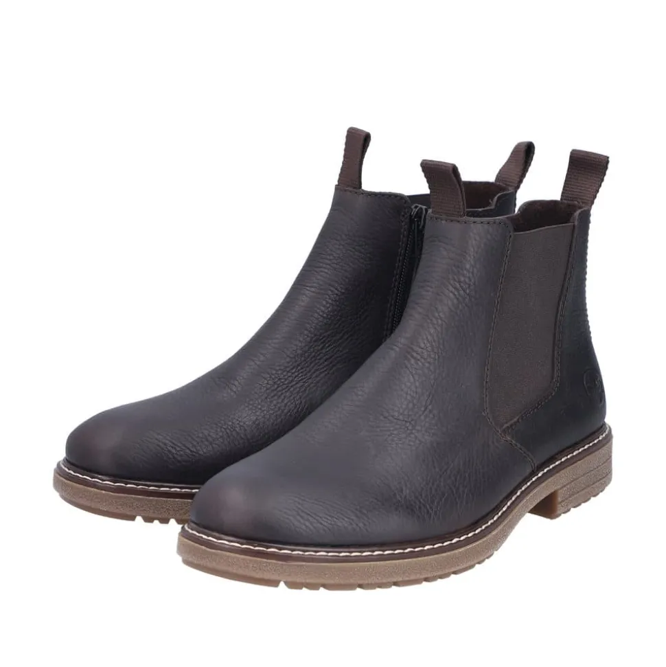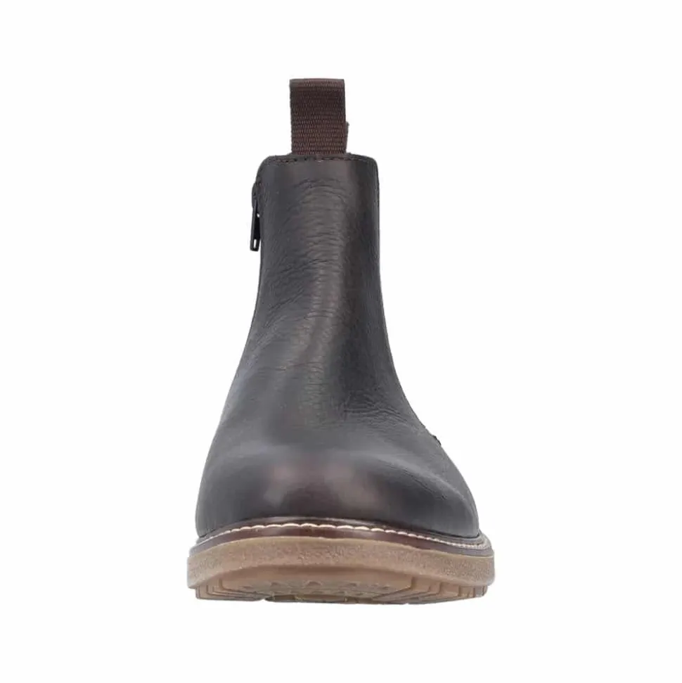 Rieker støvle til herre i mørkebrun. Flot støvle i skind, der kombinerer komfort med et klassisk look. Modellen er designet med lynlås på indersiden og elastik på ydersiden, så støvlen er nem at få af og på. Indvendigt er modellen udstyret med en blød sål og en let foring samt ekstra bredde (G), som giver foden rummelighed og fleksibilitet. Ydersålen har et godt mønster der øger stødabsorbering og skridsikkerhed.