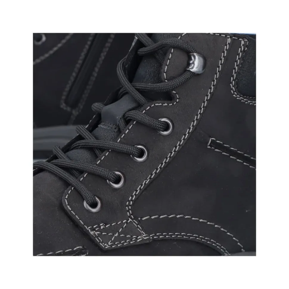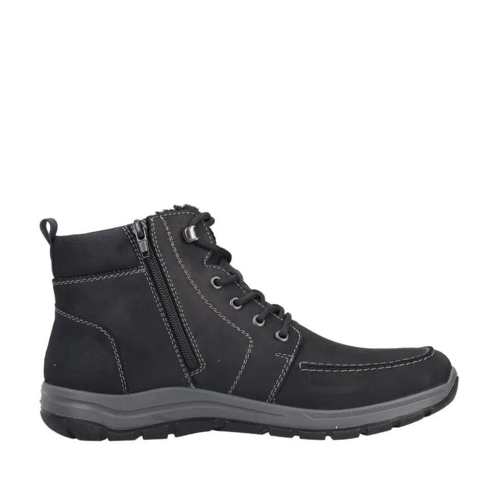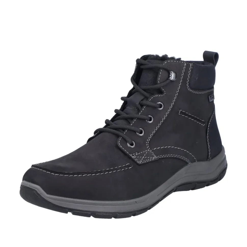 Rieker vinterstøvle til herre i sort. Snørestøvler til herrer fremstillet med en overdel i ægte ruskind. Støvlerne byder på et klassisk design kombineret med fremragende komfort. Den praktiske kombination af snørebånd og lynlås sikrer en perfekt pasform og gør det nemt at tage støvlerne af og på. Den lette og stødabsorberende sål giver dine fødder maksimal komfort hele dagen. Med en polstret og udtagelig indersål føles hvert skridt som ren forkælelse. Den ekstra brede pasform (H) giver rigelig plads til tæerne, mens den vandafvisende RiekerTEX-membran beskytter mod vind og vejr. Det bløde, varme foer holder fødderne behageligt lune, selv på kolde vinterdage. Perfekt til at kombinere funktionalitet og elegance i vinterens udfordringer.
