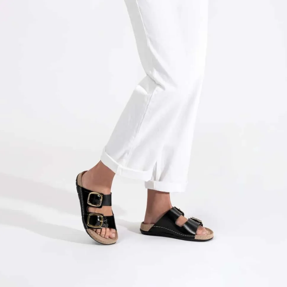 Rohde Easys N°42 sandal til dame i sort lakfarve. Dyk ned i komforten med denne klassiske og lette sandal fra Rohde. Med to justerbare spænder kan du skræddersy pasformen til din fod perfekt. Denne model er omhyggeligt fremstillet af kvalitetsskind både udvendigt og indvendigt, hvilket tilføjer en ekstra dimension af luksus og holdbarhed. Den indbyggede Memory stødabsorberende sål sikrer, at hvert skridt føles blødt og behageligt, hvilket gør den ideel til lange gåture og aktiviteter hele dagen. Memory-fodsengen har et let Memory-gelindlæg, der støtter den naturlige bevægelse, fordeler trykket og giver ekstra komfort og støtte til foden.