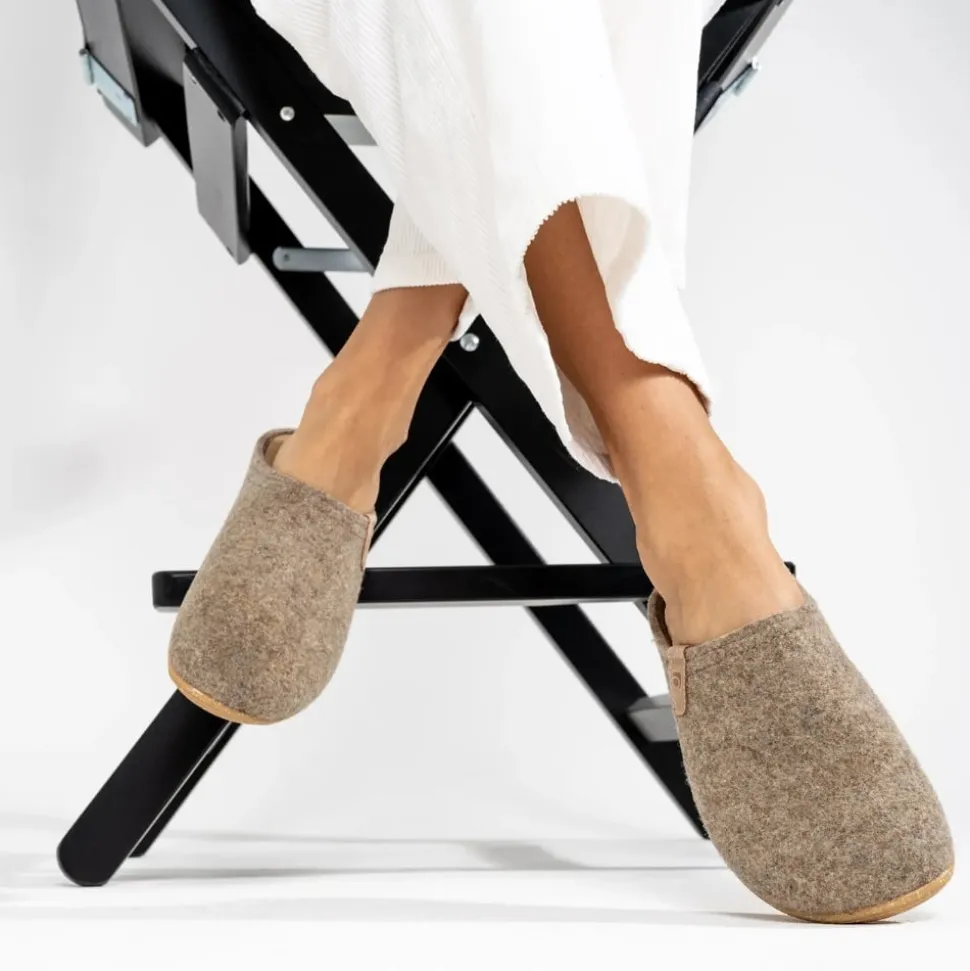 Rohde Greenys N°35 hjemmesko til dame i beige. Oplev en perfekt kombination af komfort og stil med denne bløde, ergonomiske filt hjemmesko. Den er fremstillet af 50% genanvendt uld, som holder fødderne varme og samtidig giver god åndbarhed. Indvendigt finder du en blød og udtagelig lædersål, der sikrer høj komfort. Den solide gummisål med mønster gør, at hjemmeskoen også kan bruges udenfor.