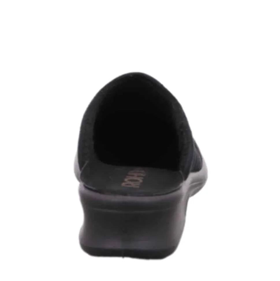 Rohde hjemmesko til dame i sort. Disse hjemmesko er både lette og moderne i en elegant sort farve med fine detaljer. De er fremstillet af blødt materiale og har en ekstra pude ved hælen, der sikrer maksimal komfort. Den solide sål gør dem perfekte til dagligdags brug derhjemme. En hjemmesko, der tilbyder en fantastisk pasform og høj komfort!