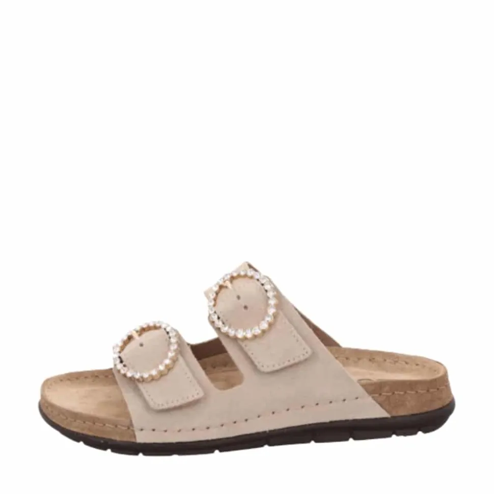 Rohde sandal til dame i beige. Denne elegante sandal i ruskind kombinerer komfort og stil på smukkeste vis. Indersålen er lavet af åndbart ruskind og har en memory-fodseng, der tilpasser sig foden og giver behagelig støtte dagen igennem. De to spænder kan justeres, så pasformen bliver helt rigtig, og de fine detaljer tilføjer et eksklusivt touch. Ydersålen er fleksibel og let, og dens mønster sikrer både stødabsorbering og et sikkert fodfæste.