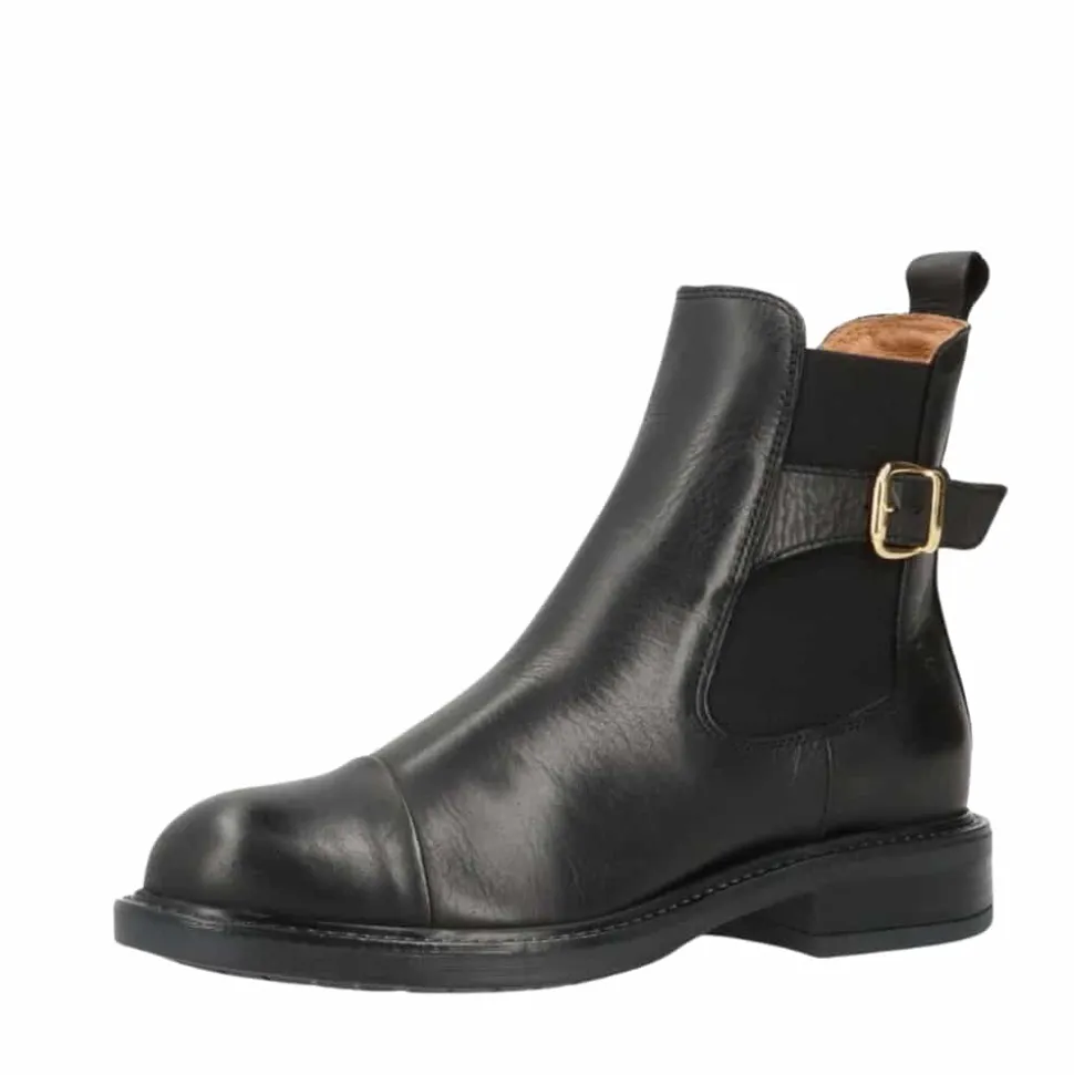 Shoedesign Copenhagen Beatrice støvle til dame i sort. Denne elegante sorte støvle kombinerer stil og komfort på bedste vis. Det gyldne spænde på siden giver et moderne look, mens elastikken og lynlåsen på indersiden sikrer en god pasform og gør den nem at tage på. Indvendigt er modellen udstyret med en blød sål, der giver komfort hele dagen. Hælen på ca. 3 cm tilfører et elegant løft, og den solide ydersål med mønster giver øget støtte og skridsikkerhed.