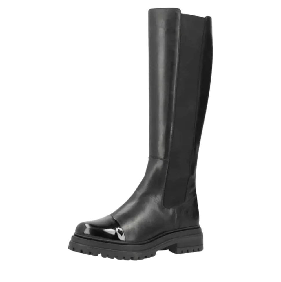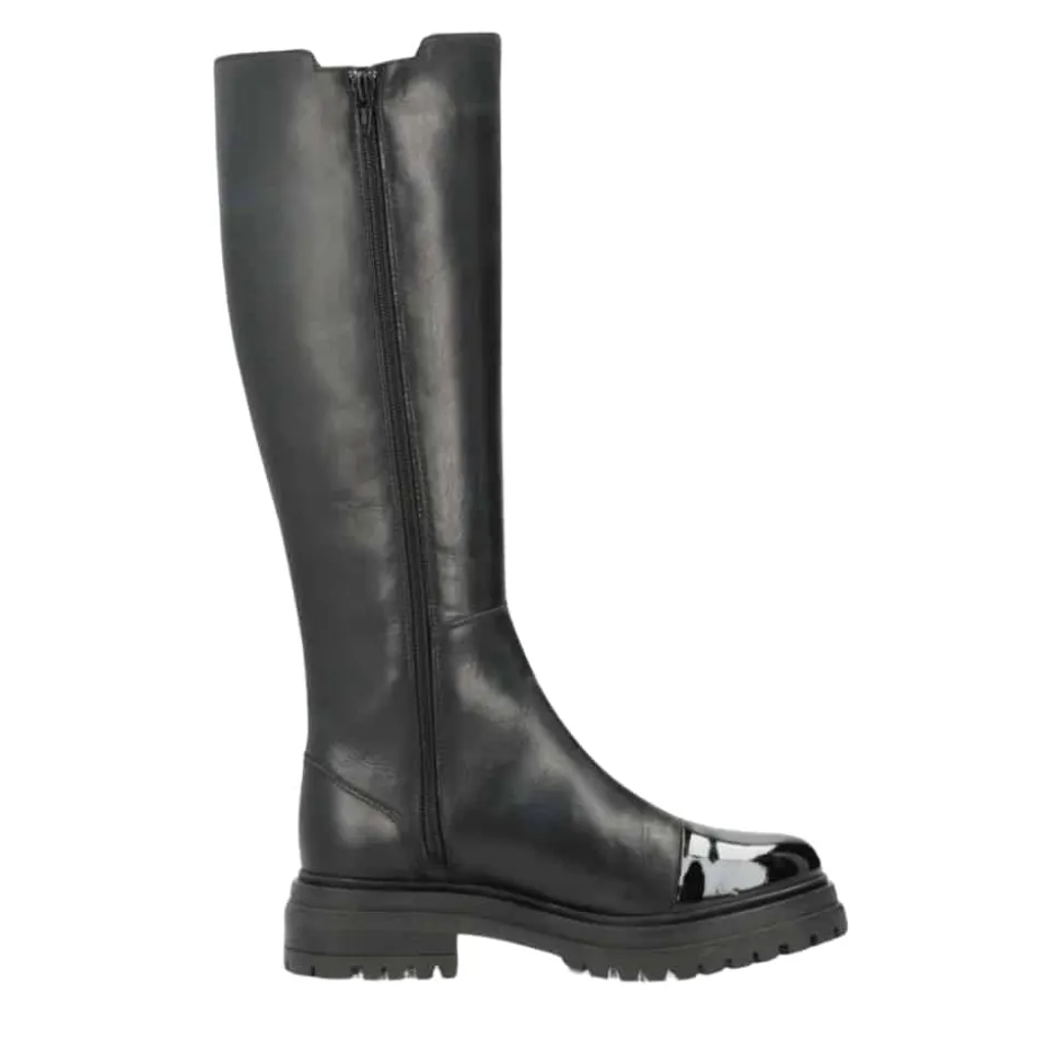 Shoedesign Copenhagen Hasta La Vista P lang støvle til dame i sort. Moderne sort støvle med flotte detaljer og en laksnude, der tilfører et stilfuldt touch. Overdelen er fremstillet i blødt skind, som sikrer en behagelig pasform. På indersiden finder du en funktionel lynlås, mens elastikken på ydersiden gør det enkelt at tage støvlen af og på. Den chunky hæl på ca. 4,5 cm giver et elegant løft og fuldender designet, uden at det går ud over komforten.