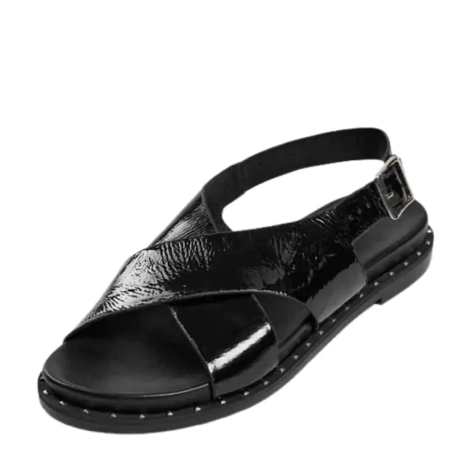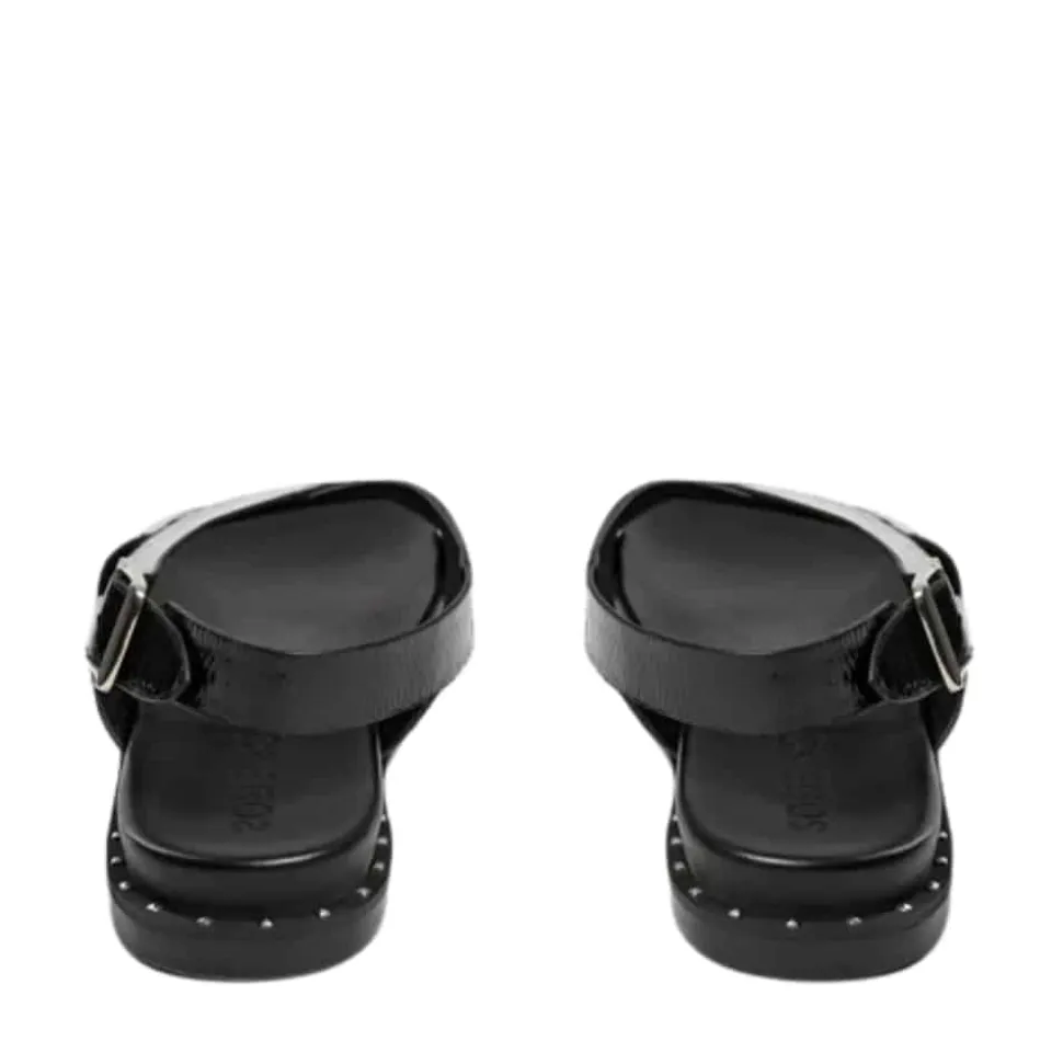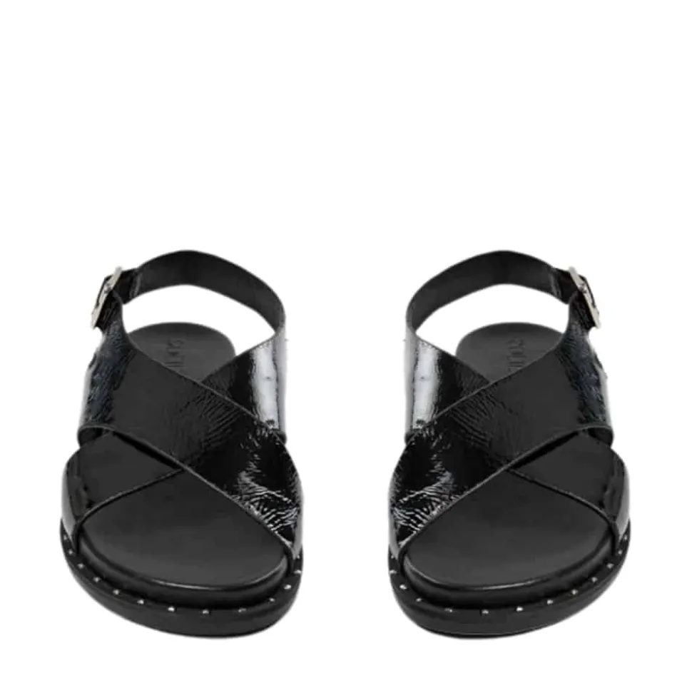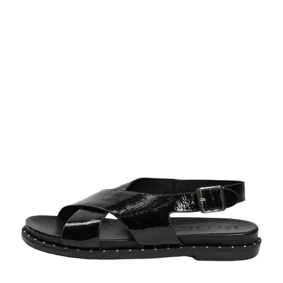 Sofie Schnoor sandal til dame i sort lak. Stilfuld sort sandal med en skinnende lakoverdel, der tilføjer elegance til dit look. Sandalen er lavet af 100% læder og har smukke krydsende remme foran. Den justerbare hælrem med spænde sikrer en behagelig pasform og gør den nem at tage af og på. Den bløde indersål giver maksimal komfort hele dagen, mens gummisålen med sølvfarvede nitter sørger for et trendy og stabilt fodfæste.