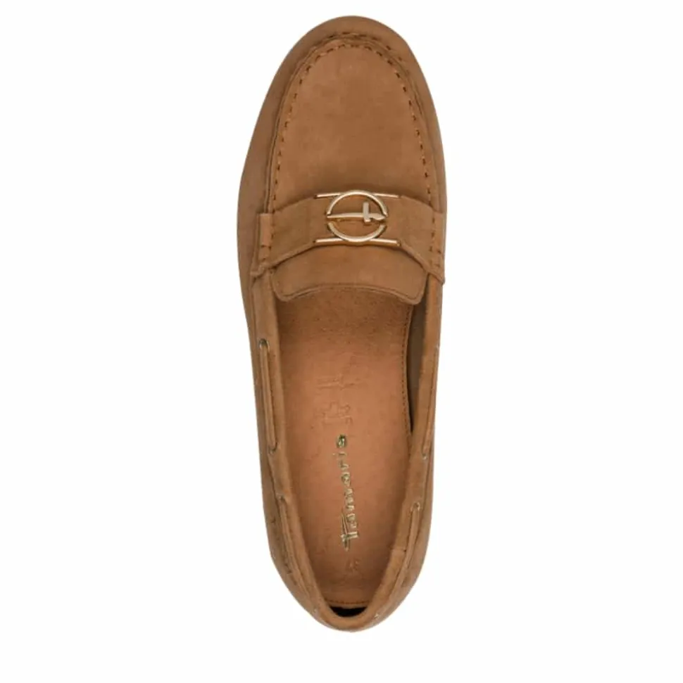 Tamaris loafers til dame i brun. Flotte loafers i brun med et stilfuldt udtryk og fokus på komfort. Skoen har en overdel i ruskind, der føles behagelig på foden, og de fine snøredetaljer sammen med den gyldne detalje foran giver et elegant touch. Indvendigt er skoen udstyret med en blød og udtagelig indersål, som giver høj komfort dagen igennem. Den mønstrede ydersål bidrager til stabil støtte og god skridsikkerhed.