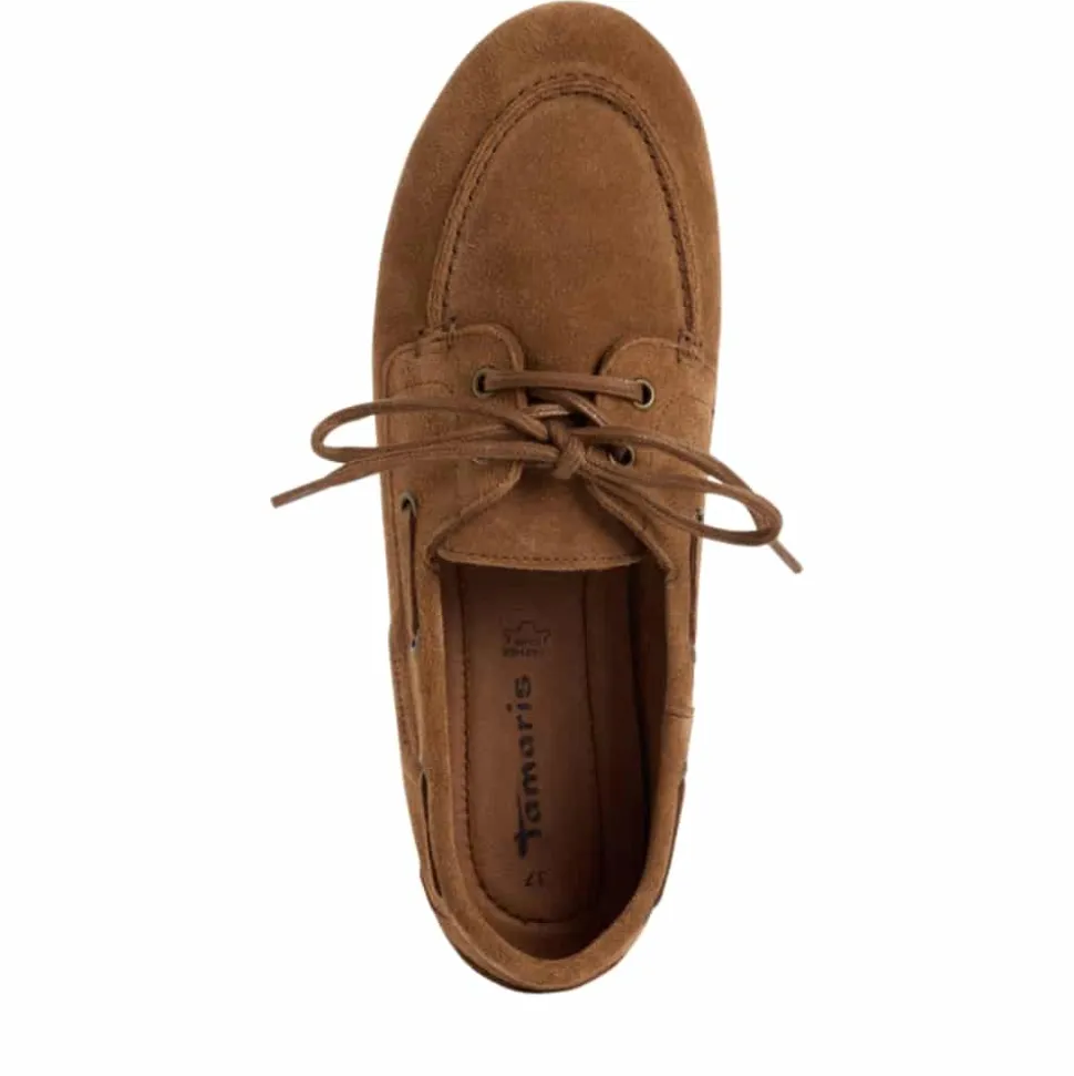 Tamaris sejlersko til dame i brun. Denne stilfulde sejlersko har en flot farve med blød ruskindsoverdel og fine detaljer, som giver et moderne udtryk. Skoen har snøredetaljer langs siden for et klassisk sejlersko look, mens snørebåndet foran gør det muligt at justere pasformen. Indvendigt er skoen udstyret med en blød indersål i skind, som giver god komfort. Ydersålen er let og fleksibel og har et mønster, der bidrager til øget skridsikkerhed.