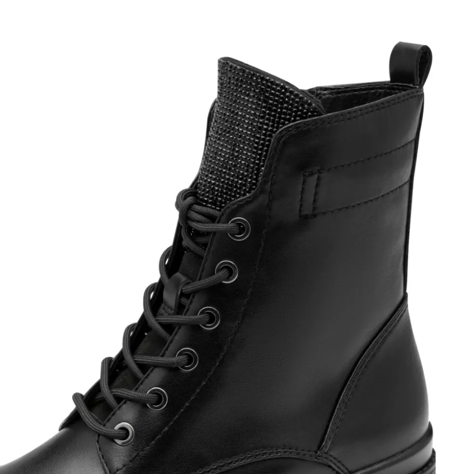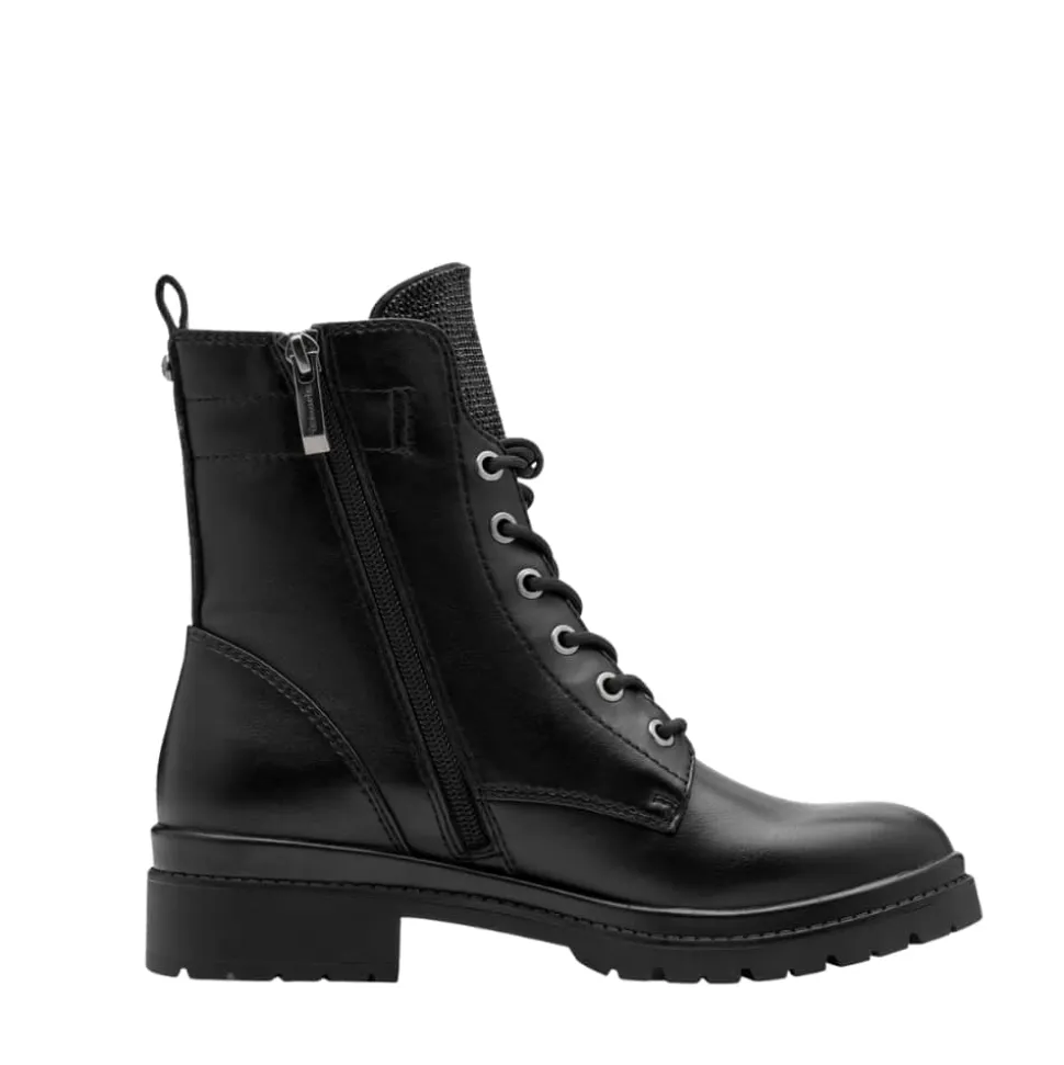 Tamaris støvle til dame i sort. Flot støvle med elegante detaljer som nitter, der giver et moderne look. Modellen har både snørebånd og lynlås, så du nemt kan justere pasformen. Indvendigt finder du en blød udtagelig Touch-sål og en let foring, som sikrer komfort hele dagen. Mens den mønstrede ydersål giver øget skridsikkerhed.