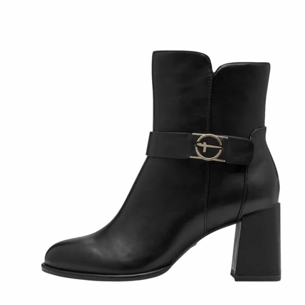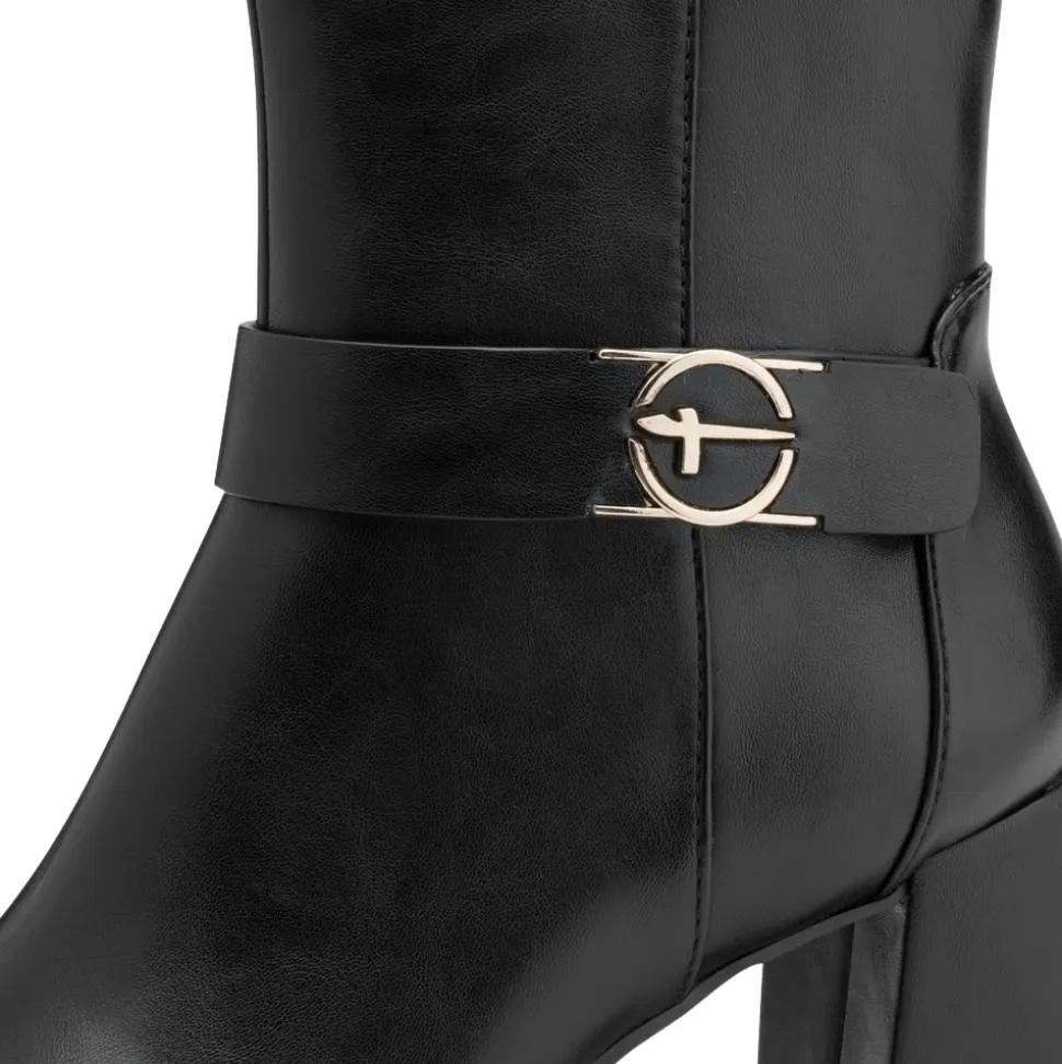 Tamaris støvle til dame i sort. Elegant støvle i sort med en gylden detalje på siden, der giver et moderne og stilfuldt udtryk. Støvlen har en funktionel lynlås på indersiden, så den er nem at tage af og på. Indvendigt er der en blød indersål med Touch It teknologi, som tilpasser sig fodens form og giver en god pasform. Den høje blokhæl på cirka 7,5 cm tilfører et elegant løft, mens ydersålen med Anti-Slide og Anti-Shock giver øget komfort og skridsikkerhed.