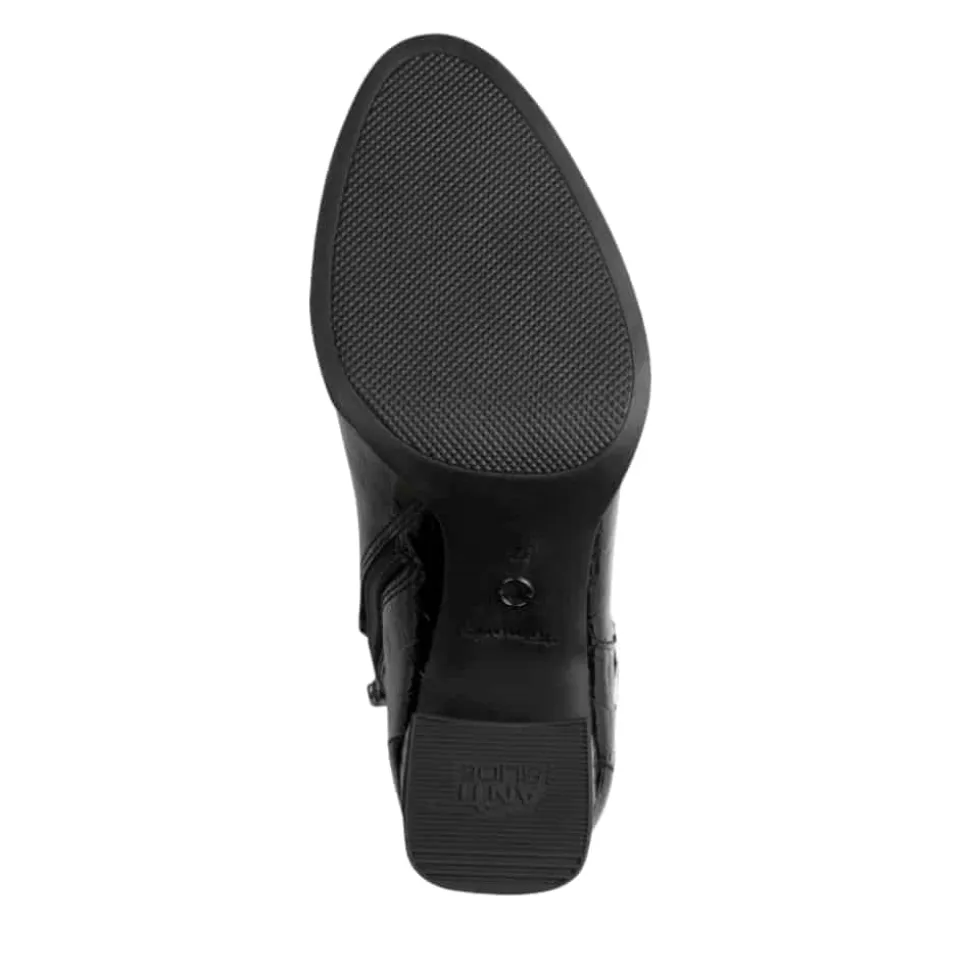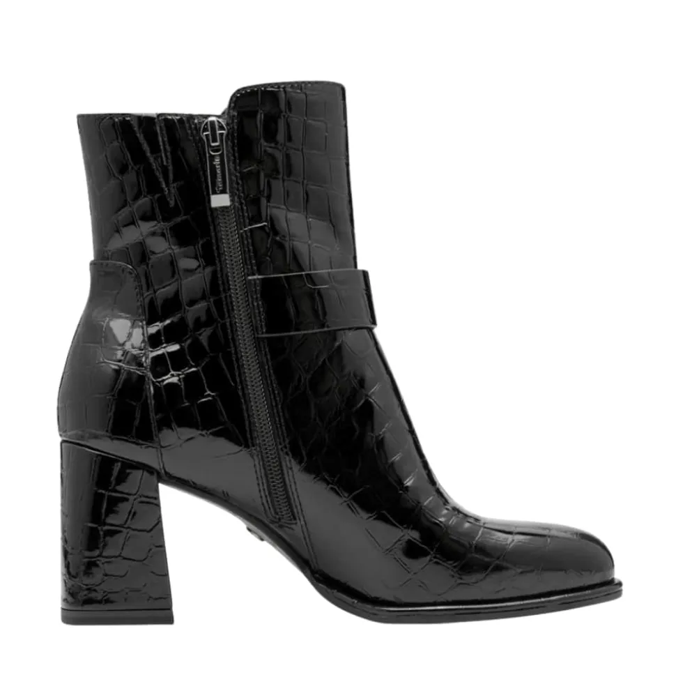 Tamaris støvle til dame i sort lak. Elegant støvle i sort med krokodillemønster og lakoverdel, som giver et moderne og stilrent look. Støvlen har flotte detaljer og en funktionel lynlås på indersiden, der gør den nem at tage af og på. Indvendigt finder du en blød indersål med Touch It teknologi, som former sig efter foden og sikrer en behagelig pasform. Den høje blokhæl på cirka 7,5 cm løfter looket elegant. Ydersålen har både Anti-Slide og Anti-Shock for øget komfort og skridsikkerhed.