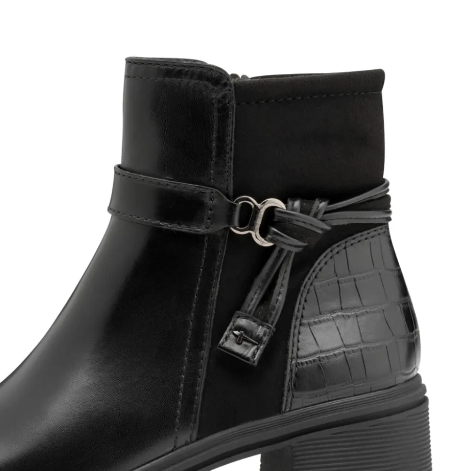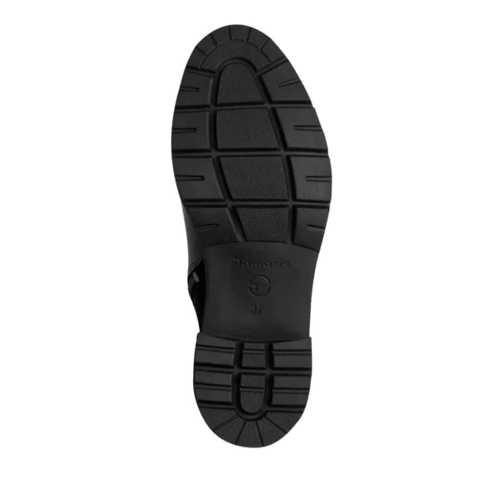 Tamaris støvle til dame i sort. Flot og elegant støvle i skind med en smuk detalje, der fuldender designet. Den funktionelle lynlås gør det nemt at tage støvlen af og på. Indvendigt finder du en let foring og en blød Touch-it sål, som former sig efter foden og giver en behagelig pasform. Støvlen har en blokhæl på 6 cm der tilfører et elegant løft, mens den mønstrede ydersål giver øget skridsikkerhed.