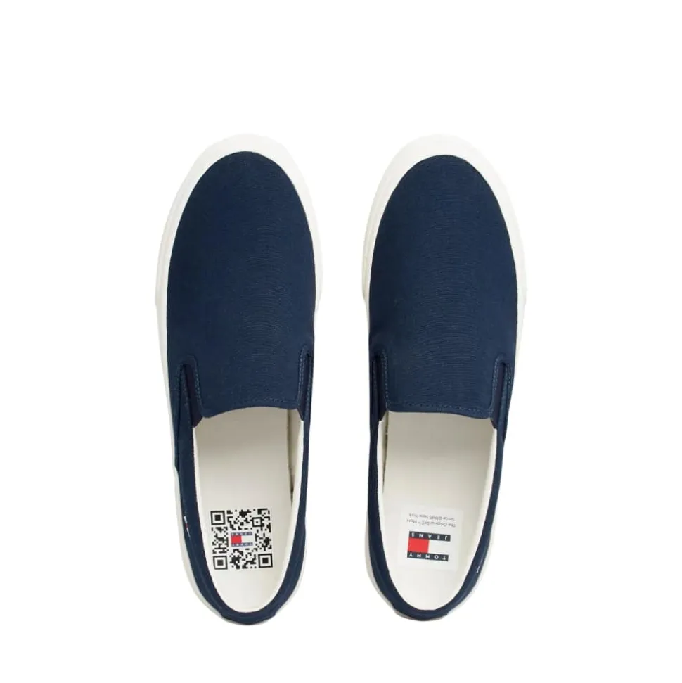 Tommy Jeans sko i mørkeblå til herre. Slip in sko fra Tommy Jeans i en elegant mørkeblå farve. Skoens ydersål er udfærdiget i naturgummi, der sikrer solidt fodfæste. Modellen er let at glide i, takket være den smarte designløsning med elastik i siderne, hvilket gør dem ideelle til travle dage. For optimal komfort er modellen udstyret med udtagelige såler, der giver dig mulighed for at tilpasse skoene efter dine egne præferencer eller erstatte sålerne, når det er nødvendigt.