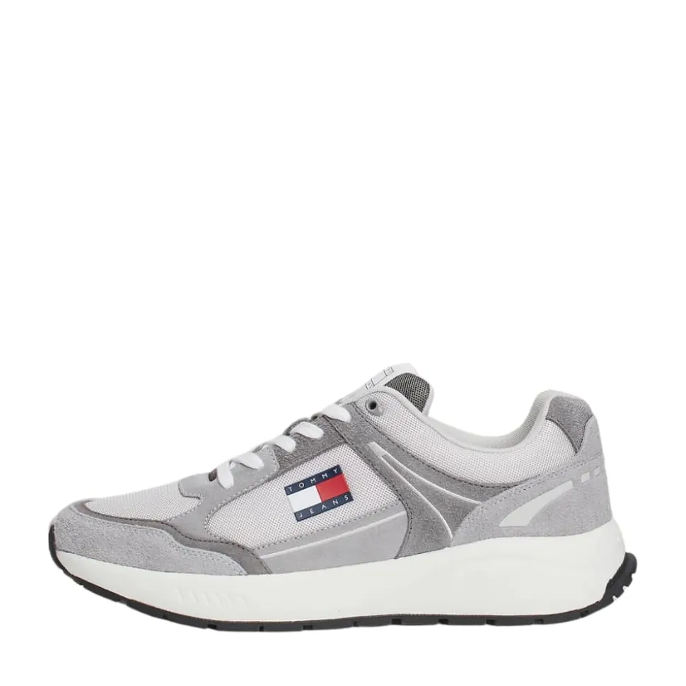 Tommy Jeans TJM Runner sneakers til herre i grå. Denne sneakers er lavet med ægte ruskindsdetaljer, som giver et stilfuldt og moderne udtryk. Den er designet i en flot farvekombination, og de små Tommy Jeans-detaljer tilføjer ekstra et ekstra strejf af stil. Indvendigt har skoen en blød, udtagelig sål, som sikrer behagelig komfort hele dagen. Skoen har snørebånd foran, der kan justere efter dine behov, hvilket bidrager til en god pasform. Ydersålen er lavet af gummi, hvilket giver dig god støtte og et sikkert fodfæste, uanset hvor du går.